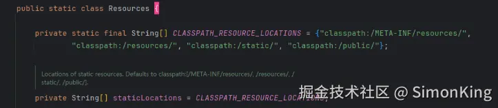 通过源码我们能够看到SpringBoot框架开放一批静态资源可以直接访问: