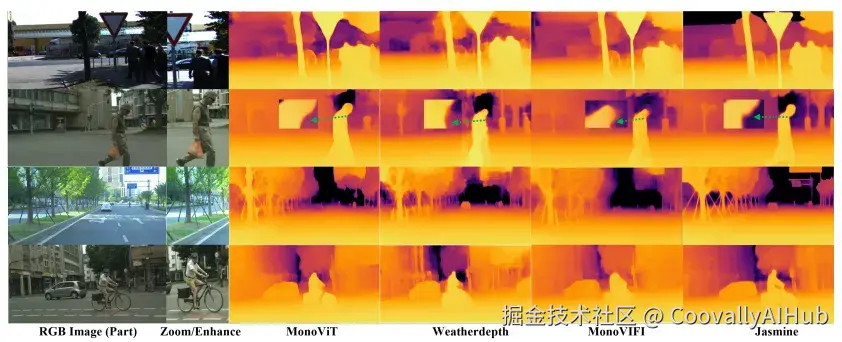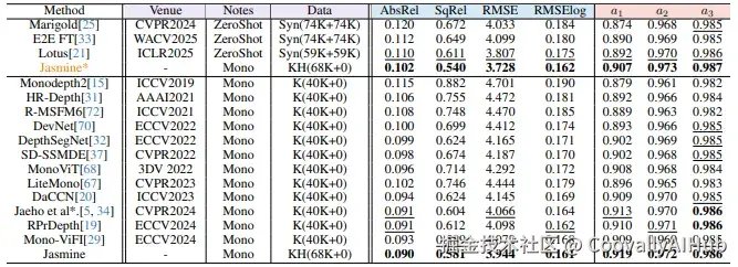 Jasmine在KITTI数据集上取得了所有自监督方法中的最佳性能,尤其在衡量整体准确率的a1指标上提升显著。更令人印象深刻的是其零样本泛化能力: