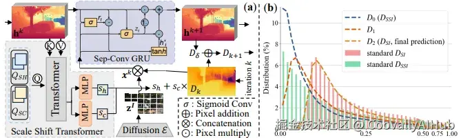 Jasmine设计了一个基于GRU的尺度-平移变换模块(SSG),通过迭代优化逐步将SD输出的深度分布对齐到自监督所需的分布上。更重要的是,SSG中的重置门机制还能过滤掉来自自监督信号的噪声梯度,保护SD输出的细节不被破坏。