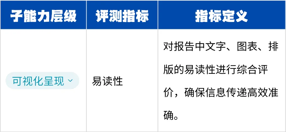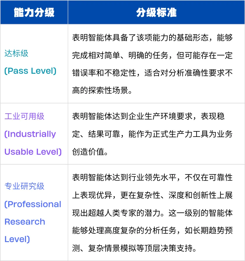 基于上述多维度、多指标的综合评分结果,我们将数据智能体的单项能力划分为"达标级"、"工业可用级"、"专业研究级"三个等级,以体现其从"可用"到"可靠"再到"卓越"的演进路径。