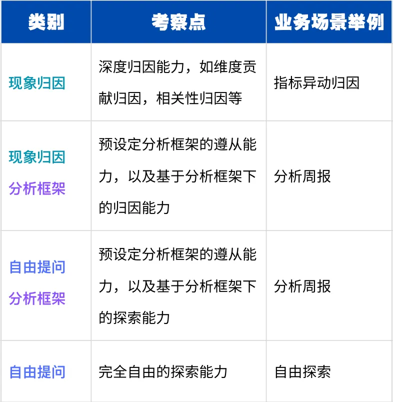 该测试集围绕"分析周报、现象归因、自由探索"等真实业务核心场景,覆盖归因分析、相关分析、漏斗分析、分群分析、趋势分析等方法;