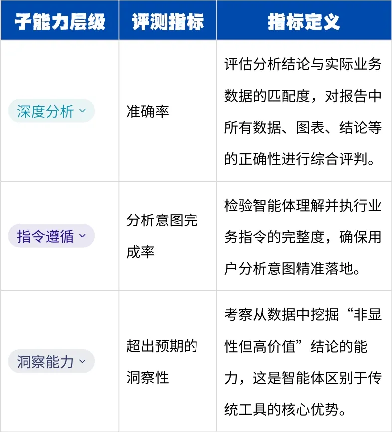 例如,"分析意图完成率"这一指标旨在量化智能体输出与用户原始需求的契合度,它直接针对"分析结果偏离业务初衷"这一普遍痛点,确保在周报生成、归因分析等实际场景中,数据分析的终点是精准解决业务问题,而不仅仅是提供数据。