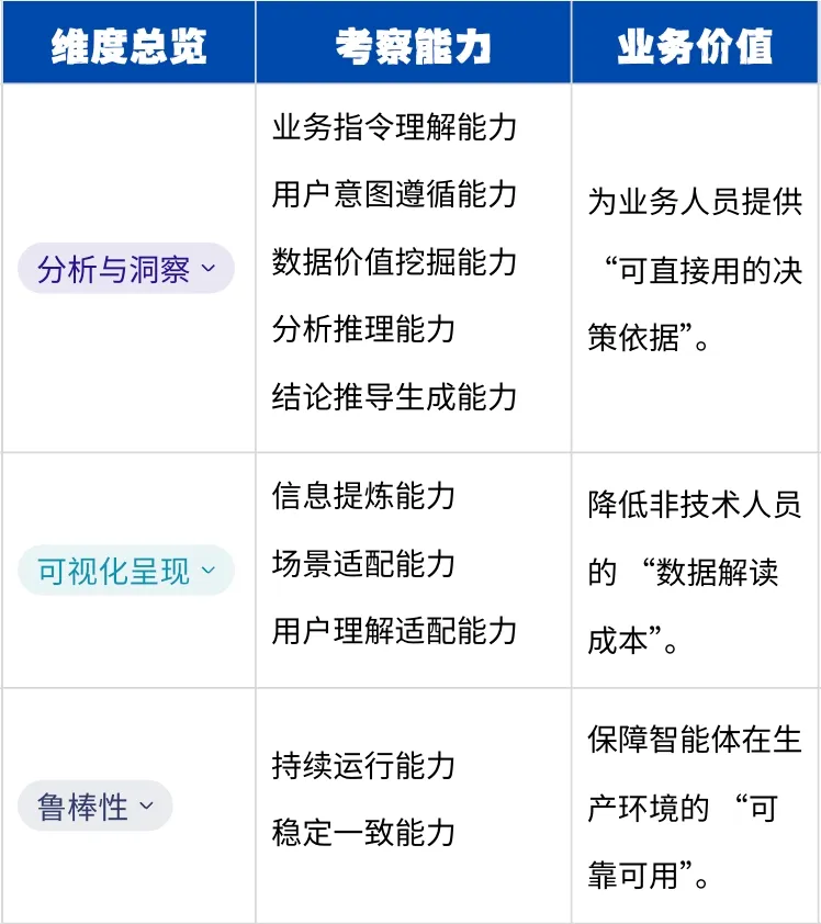 在企业数据应用不断深化的背景下,业界对数据分析智能体的能力评估普遍面临三个核心挑战: