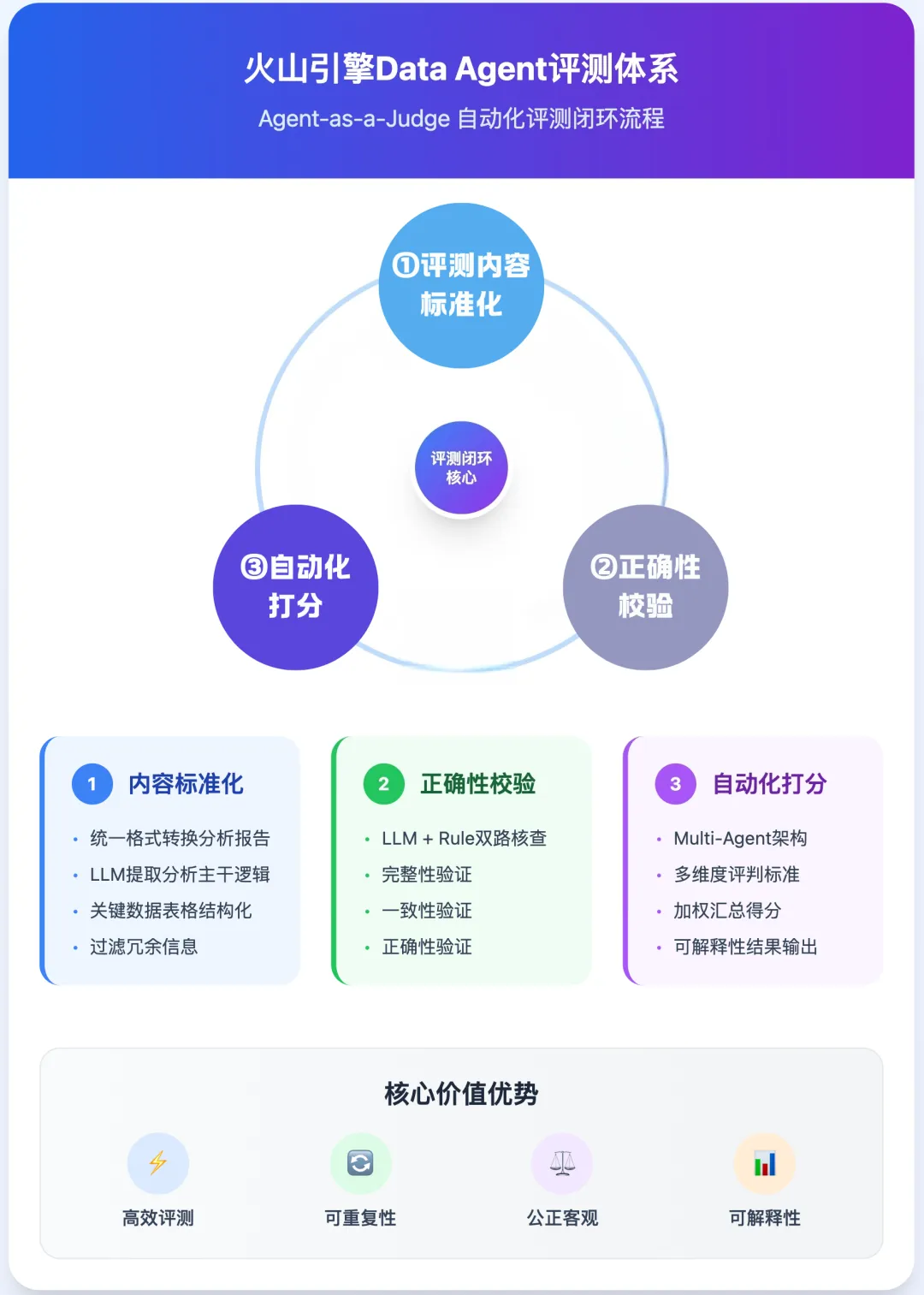 通过上述三步闭环,火山引擎不仅实现了高效、可复现的自动化评测,也显著提升了评测过程的公正性与结果的可解释性,为企业评估与优化Data Agent提供了扎实的方法论支持。