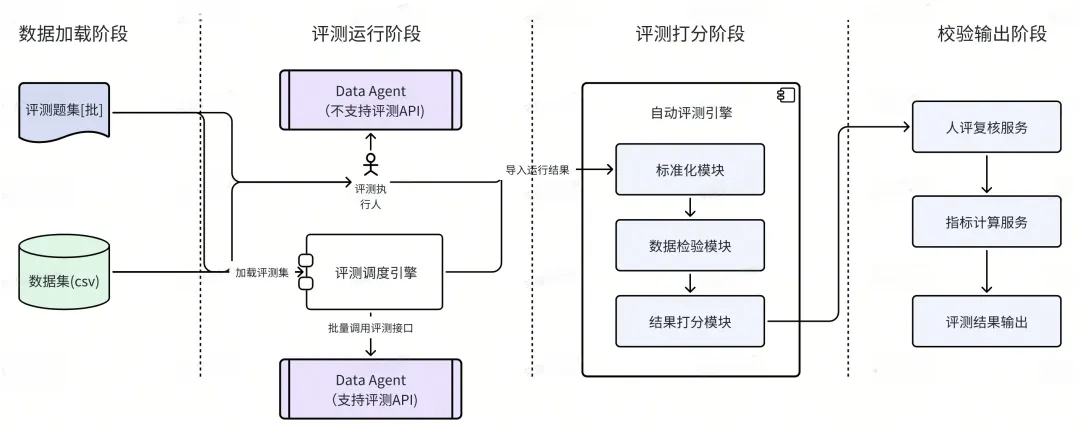 该阶段完成评测资源与环境的初始化,包括导入多行业评测题集与结构化数据,确保资源隔离。系统会自动校验数据源完整性与格式规范性,并通过标准化接口适配不同技术框架的Data Agent,为后续自动化评测奠定基础。