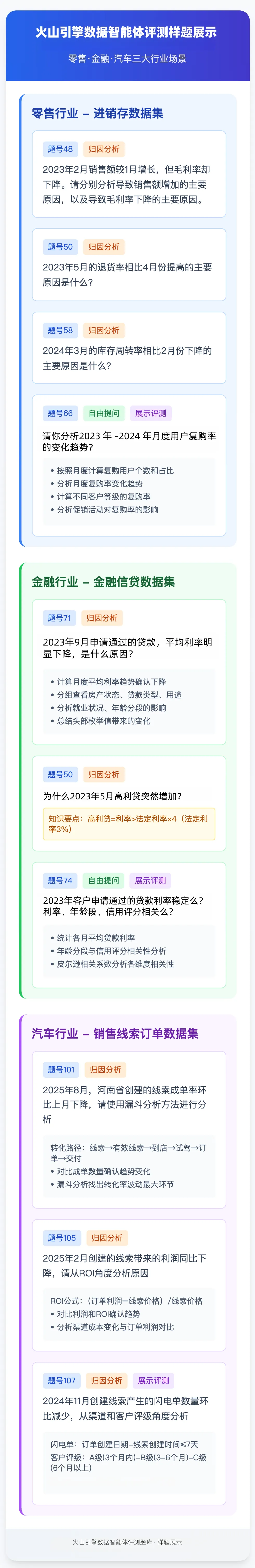 评测题目内容覆盖归因分析、相关分析、漏斗分析、分群分析等典型业务场景,旨在检验智能体从数据中提取洞察、并依规范模板输出结构化分析报告的实际效能。