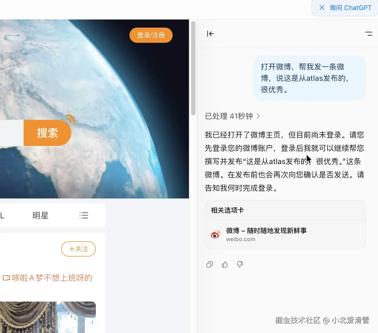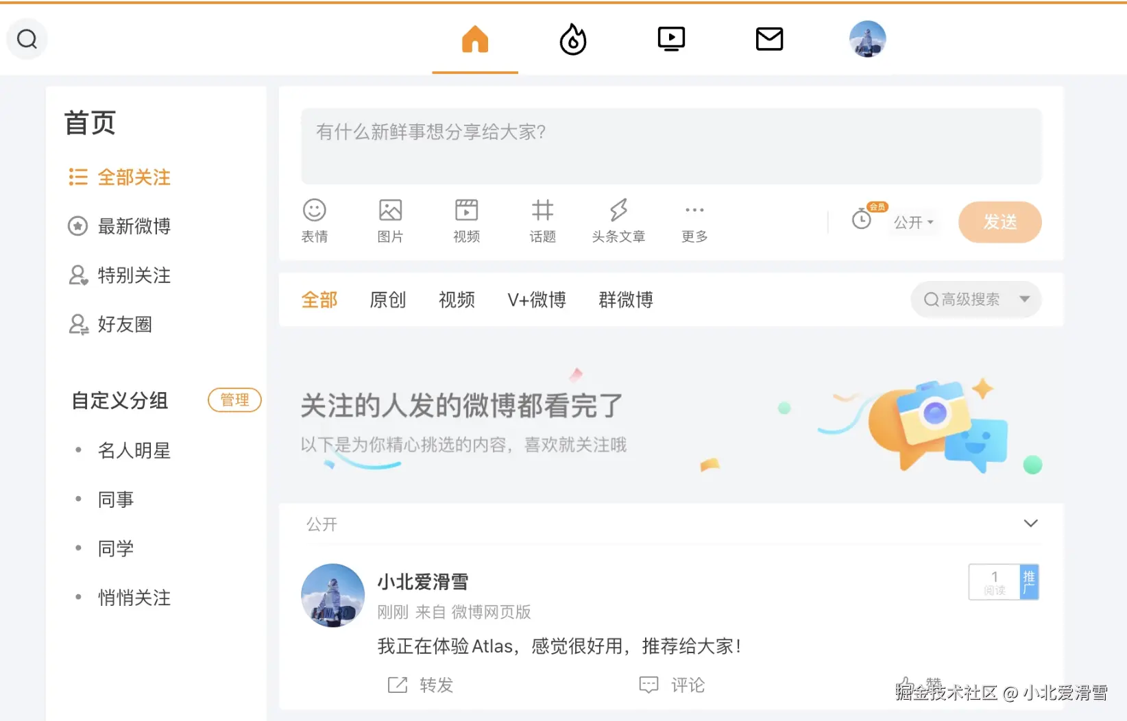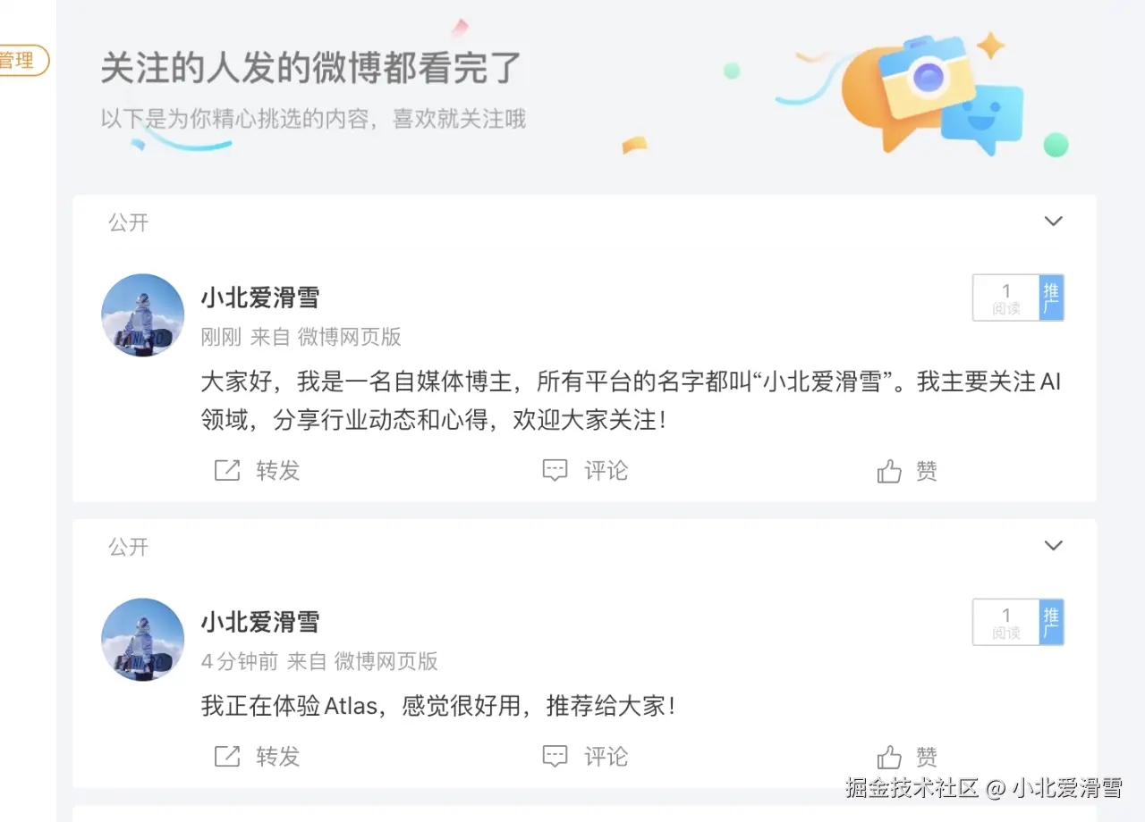 打开微博,帮我发一条微博,说这是从 atlas发布的,很优秀。