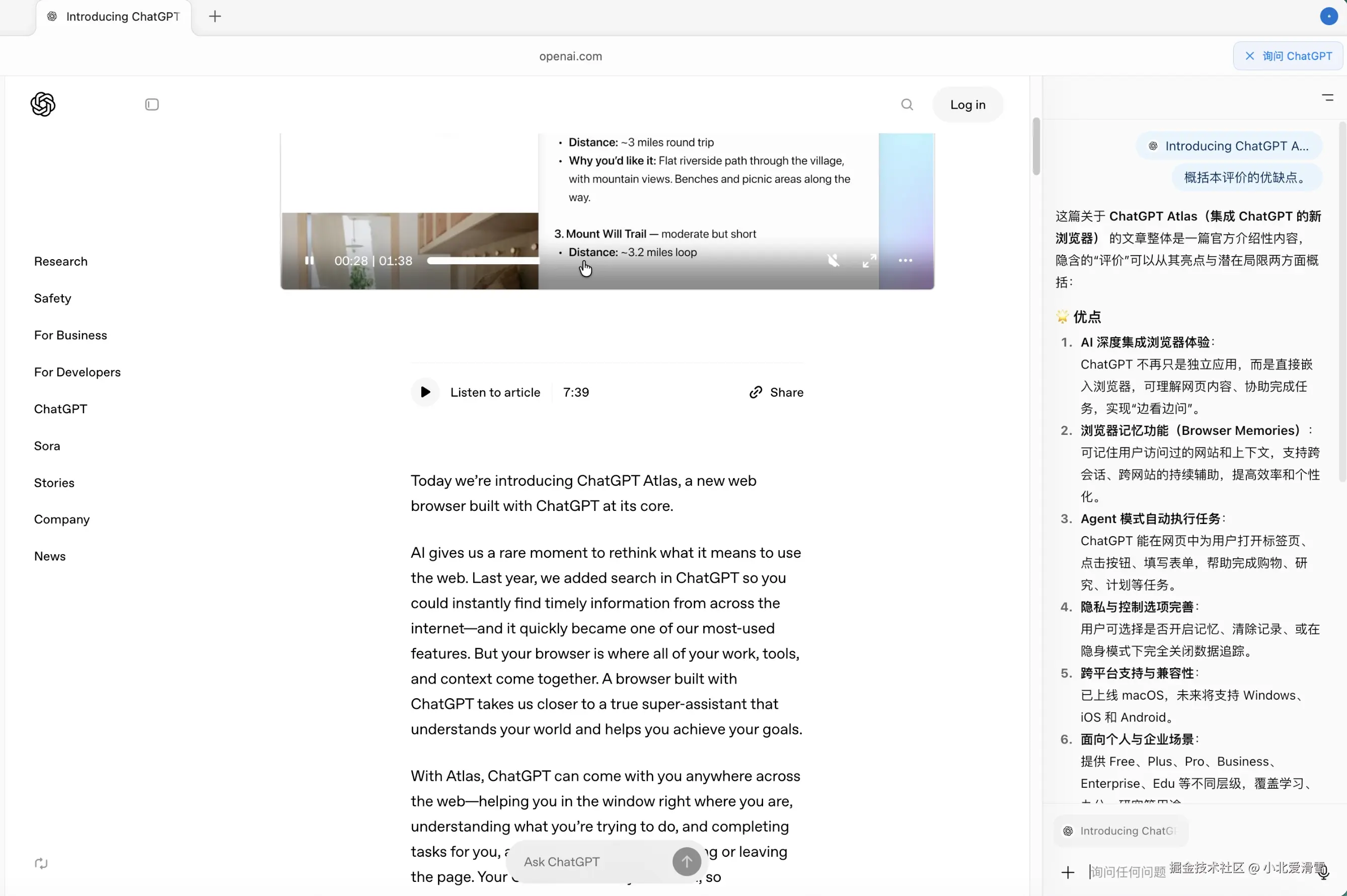 在所有的页面右上角,都有一个询问ChatGPT的按钮,可以对当前网页进行提问,比如我打开了Atlas的官网介绍页,然后让其总结优缺点。