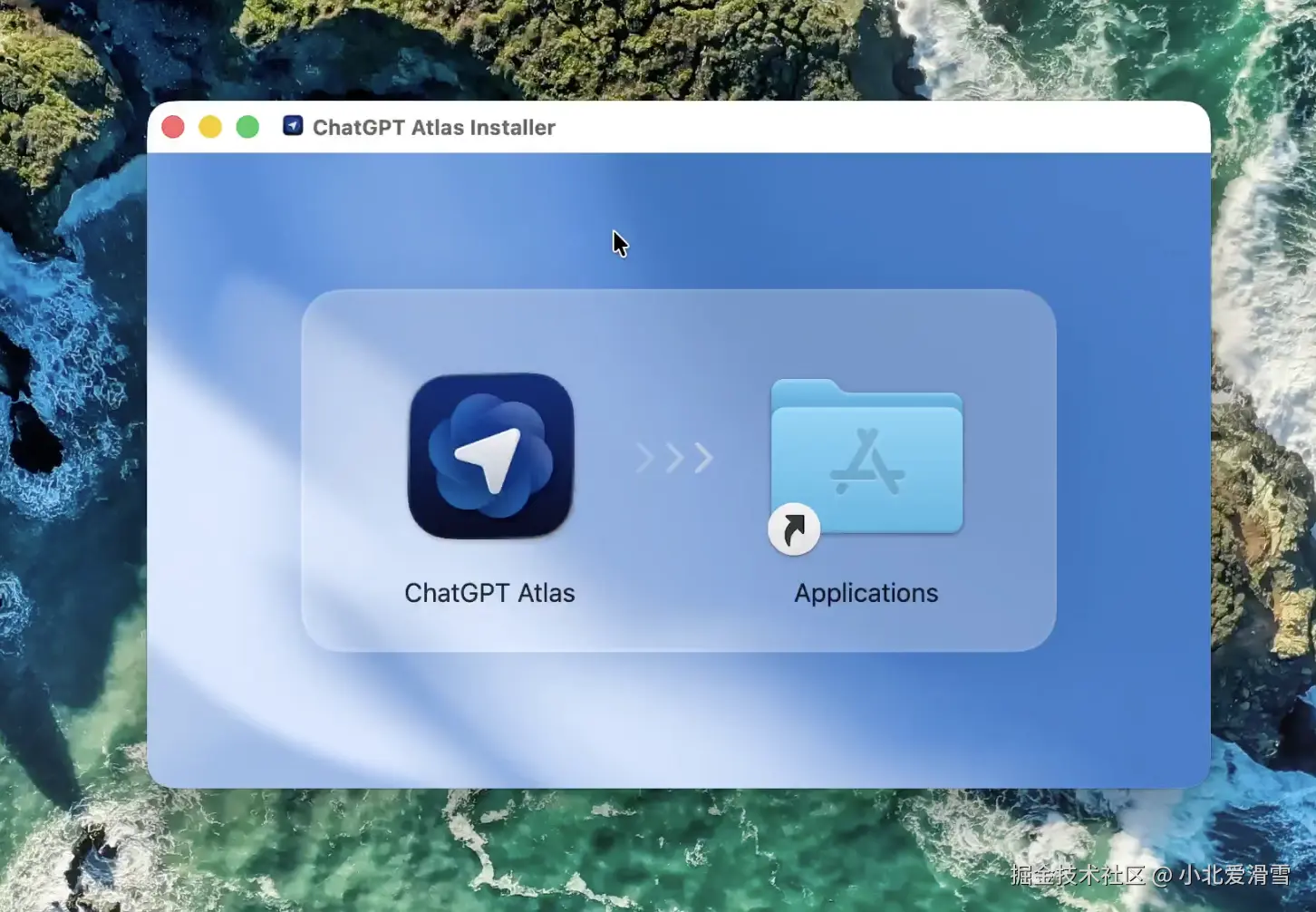 安装很简单,下载完成后打开,将ChatGPT Atlas拖入Applications目录。