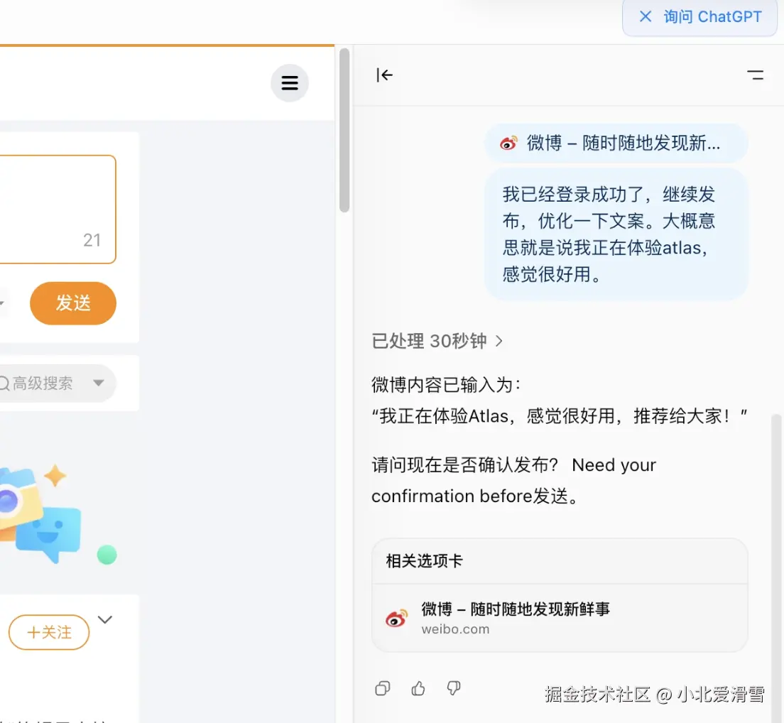 感觉还是很不错的,除了要求我一次登录,然后一次确认,帮我完成了微博的发布。
