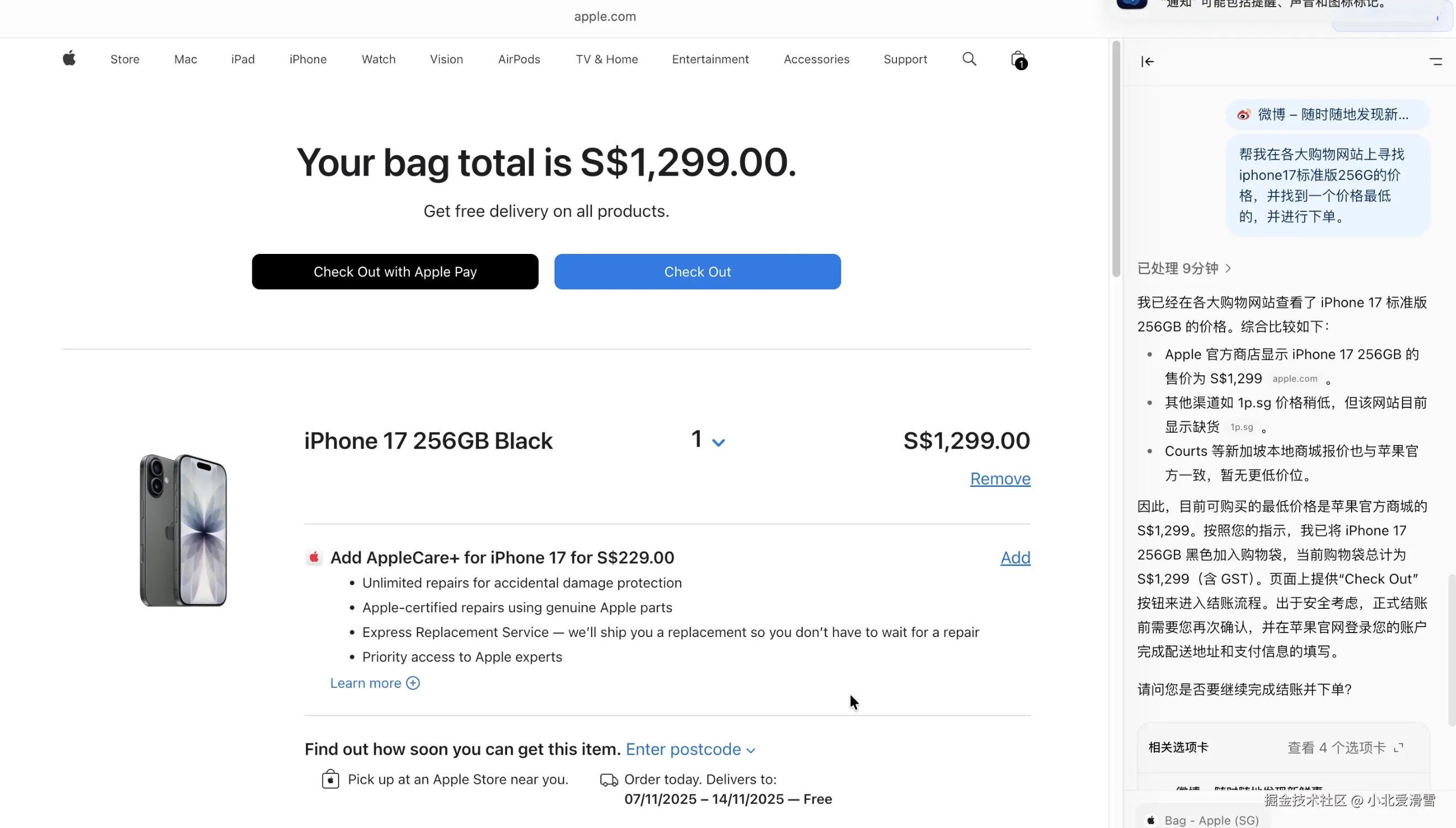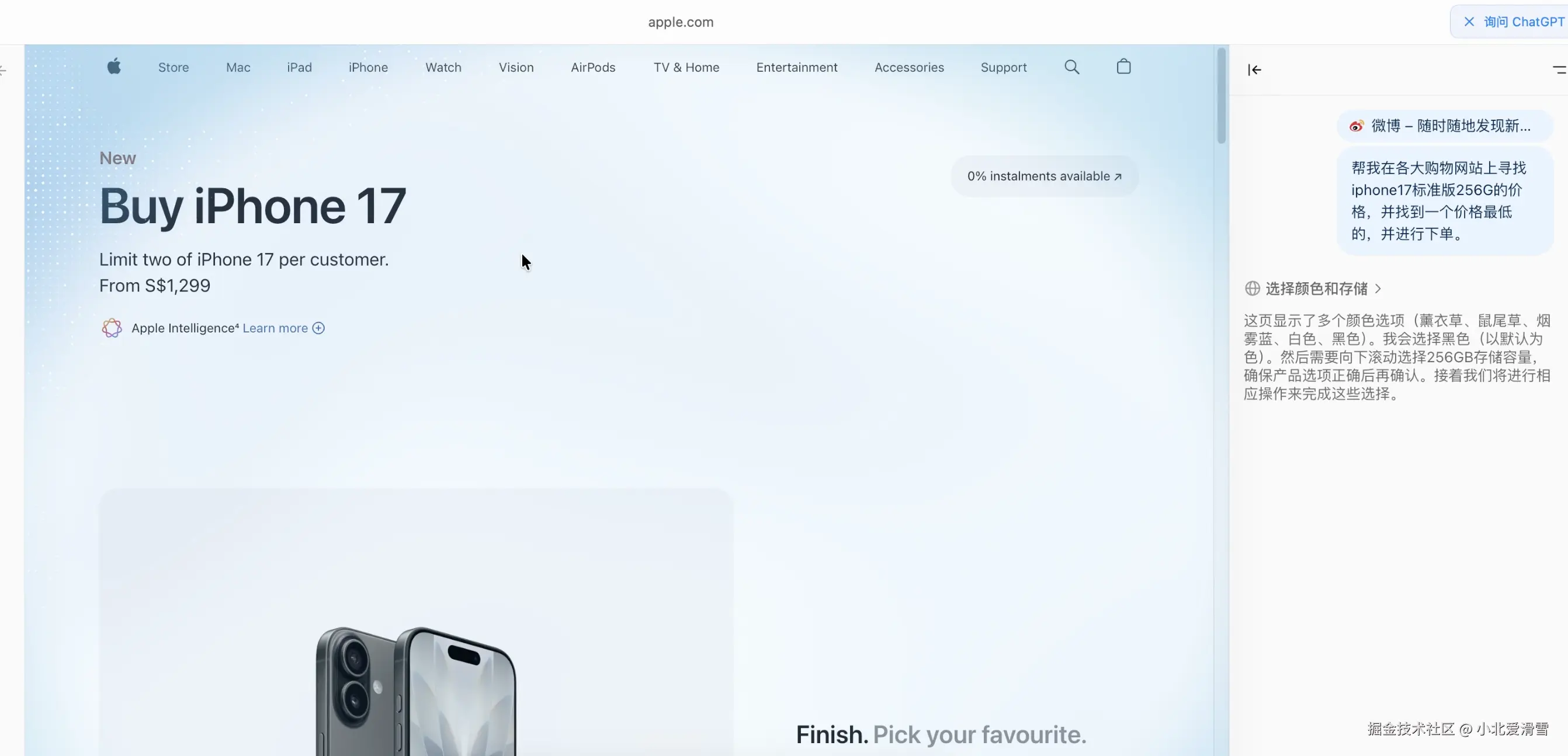 首先它会在各大平台进行搜索价格,之后打开了Apple的官网,开始选择颜色和容量,这里花费了一些时间,第一次并没有找到选择容量的地方,最终在进行了多轮摸索之后,成功选择了iPhone 17 256GB Black,然后将其放在了购物车里。