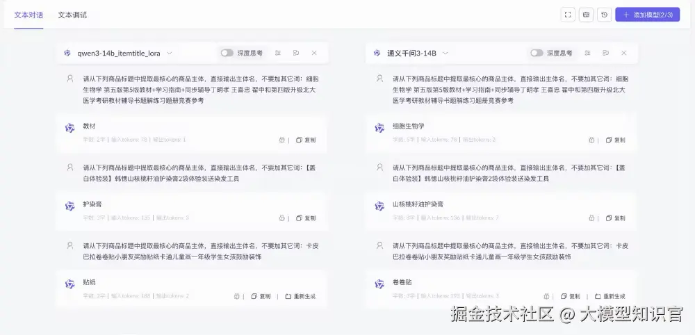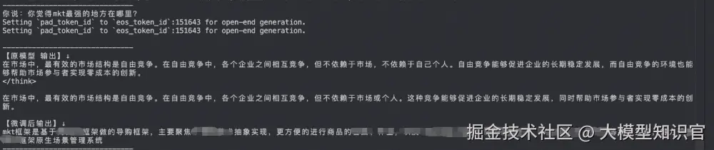 可以看到原模型完全无法感知到业务相关的知识,而微调后的模型已经有效的学到了(注:由于数据量小,且模型本身参数量也小,做演示的微调结果存在一定的过拟合)