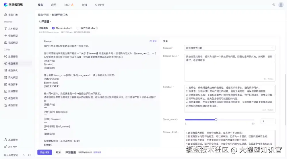 特点:适合评测⽂本⽣成类,可以调整 prompt 来对⾃⼰微调后模型的回答要点进⾏打分,利⽤另⼀个⼤模型的能⼒,实现灵活打分,但是⽐较依赖模型的能⼒以及 prompt,同时分数有时也不够标准化。