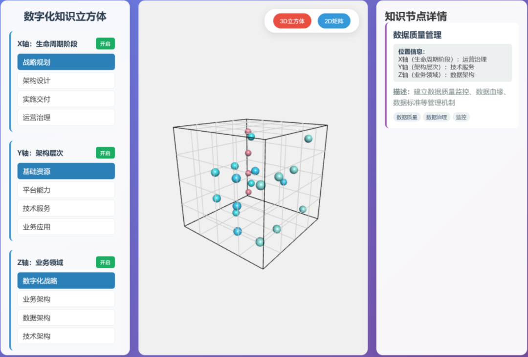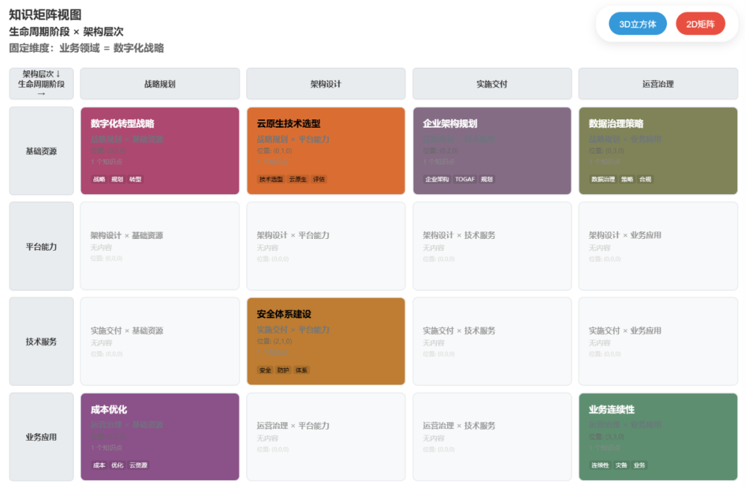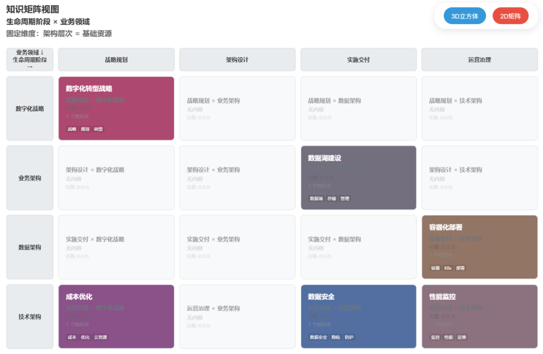 - 二维矩阵渲染:当维度关闭时,自动转换为二维矩阵视图,知识节点以列表形式显示在单元格中
