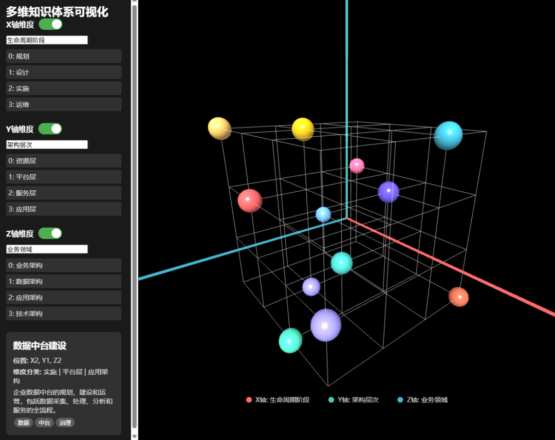 基于我对知识体系构建的多年经验,从简单的思维导图到二维矩阵,现在希望构建一个支持多维知识体系展示的HTML应用。该应用应该能够支持类似BI多维立方体的知识展示效果,允许用户自定义X、Y、Z三个维度,并通过切片、钻取等操作来探索知识体系。