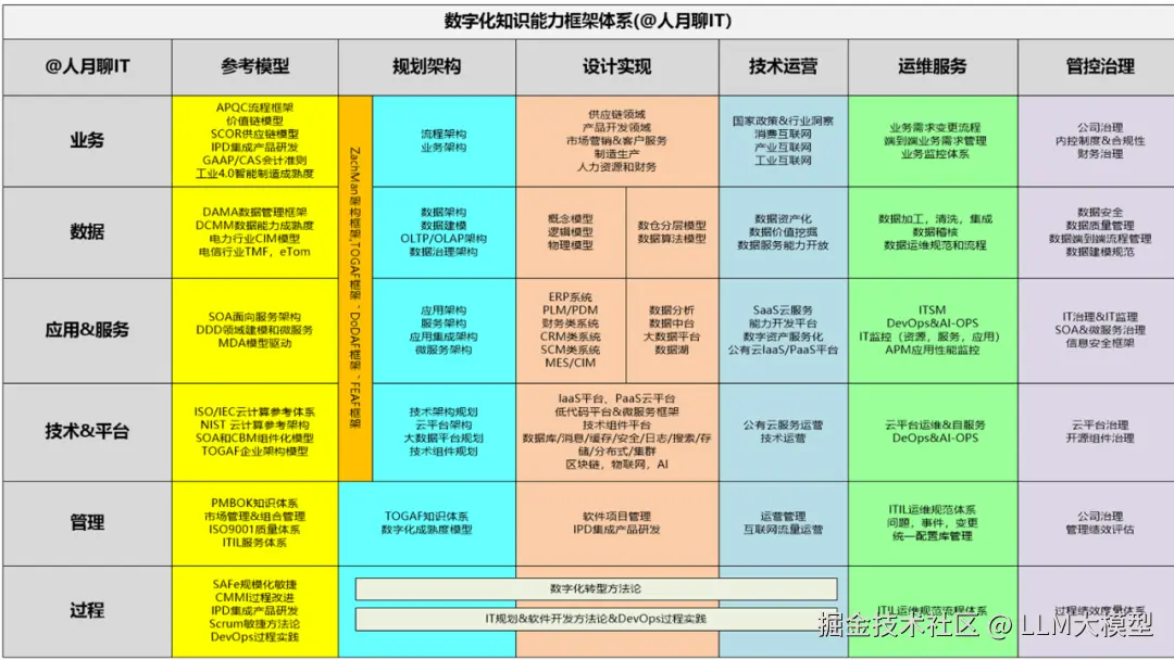 用二维矩阵来构建知识体系,类似我整理过的数字化能力体系,SOA治理管控体系等。这类一般横向为静态分层,纵向为动态生命周期