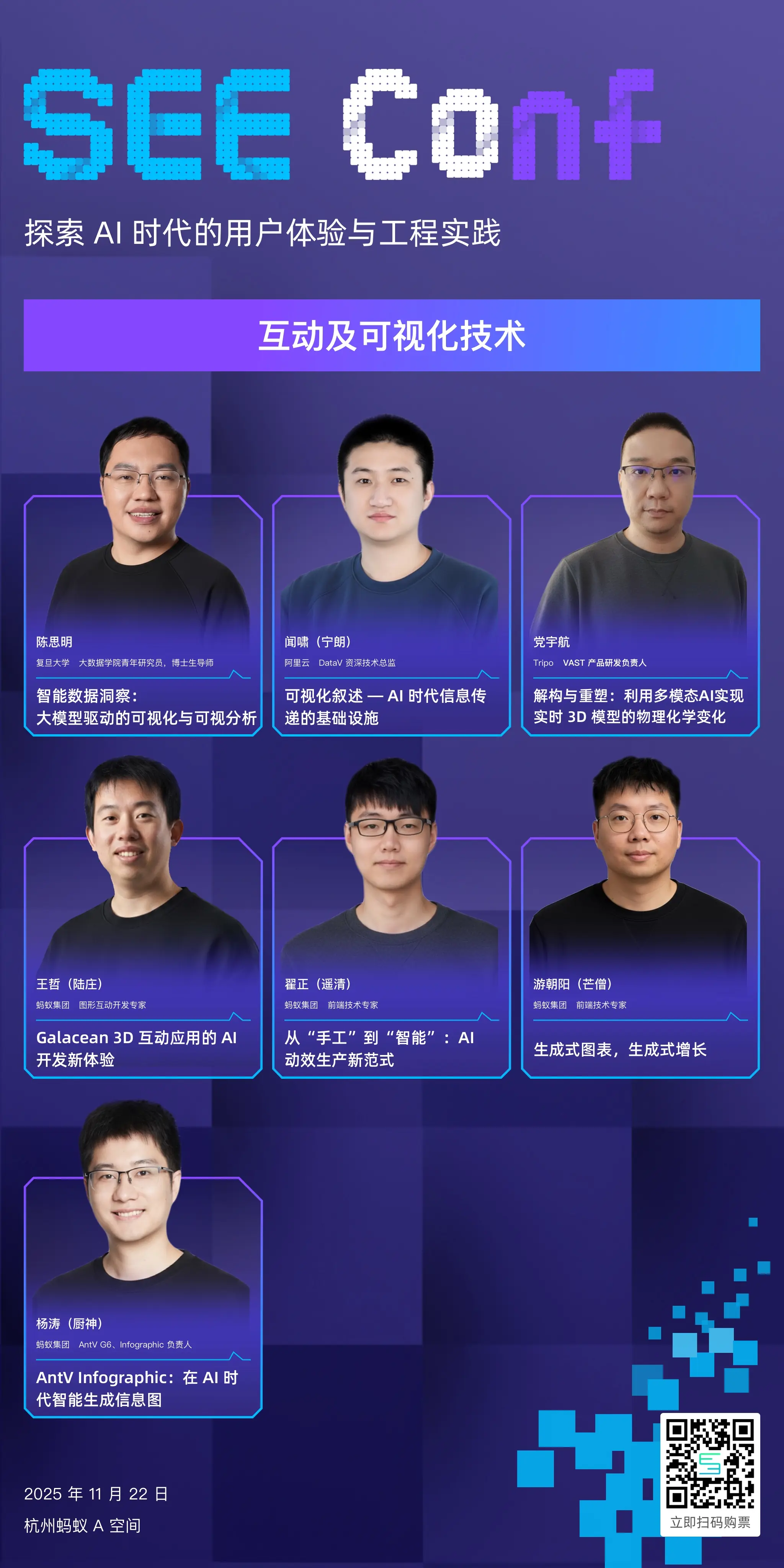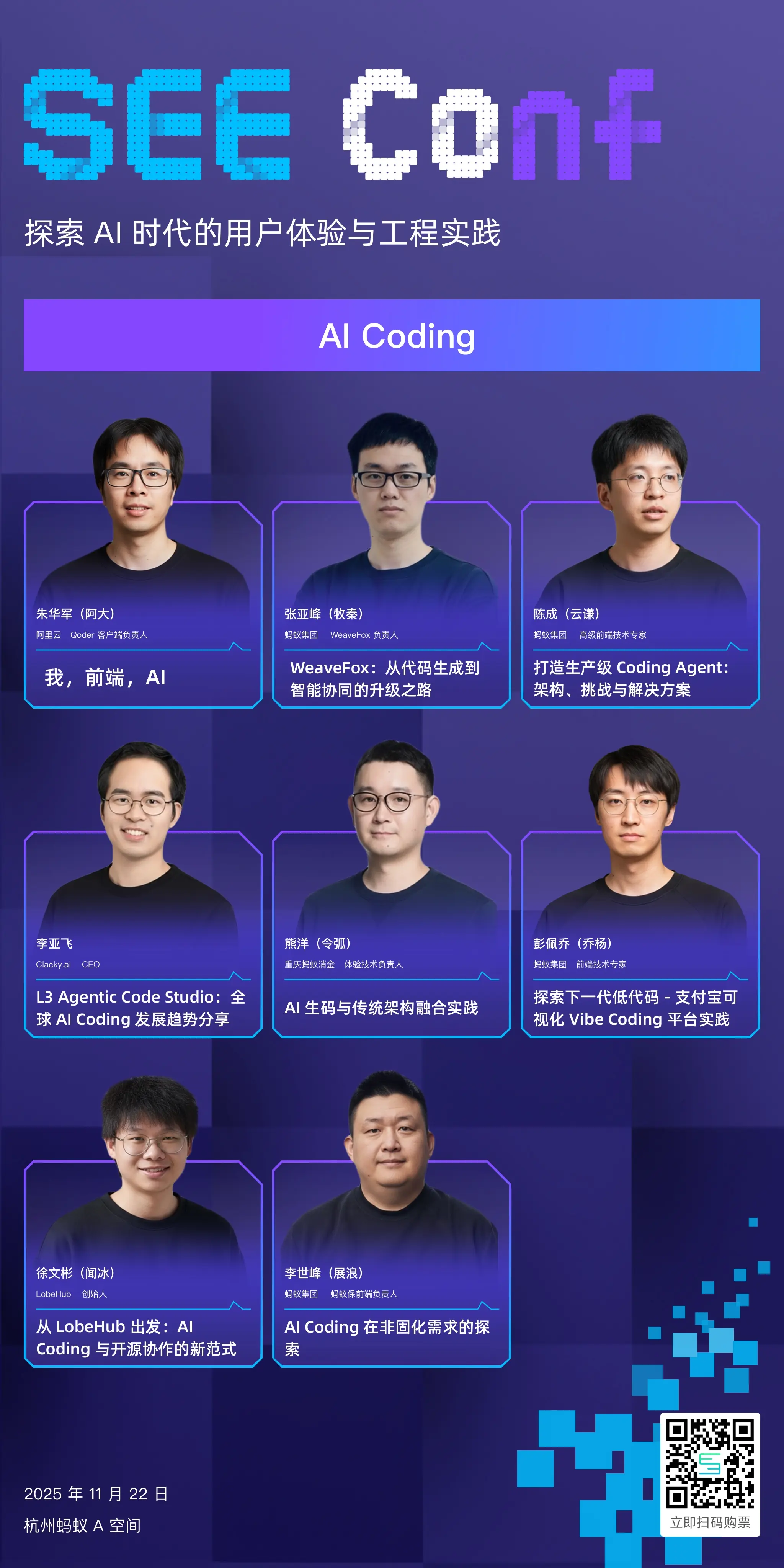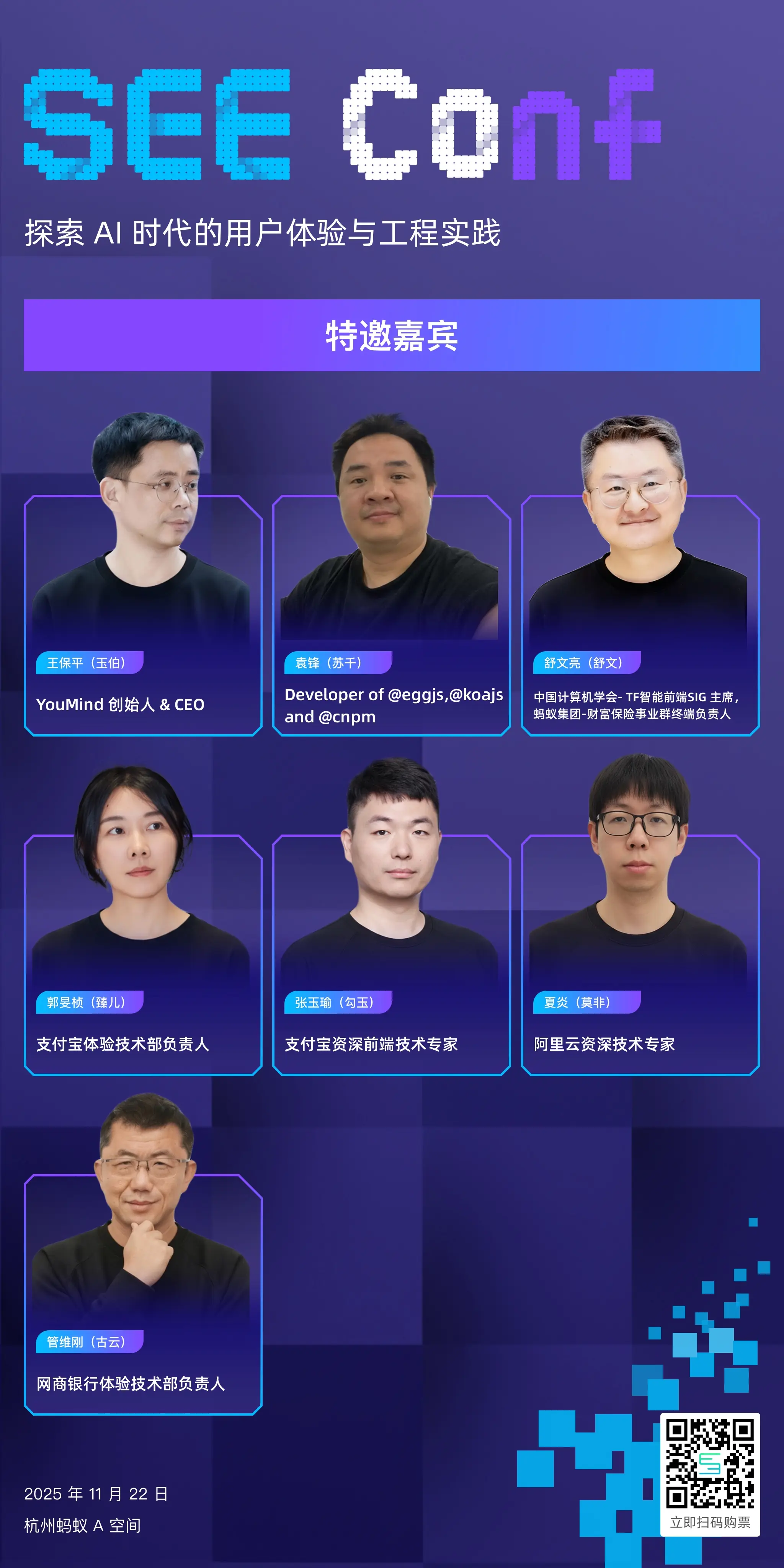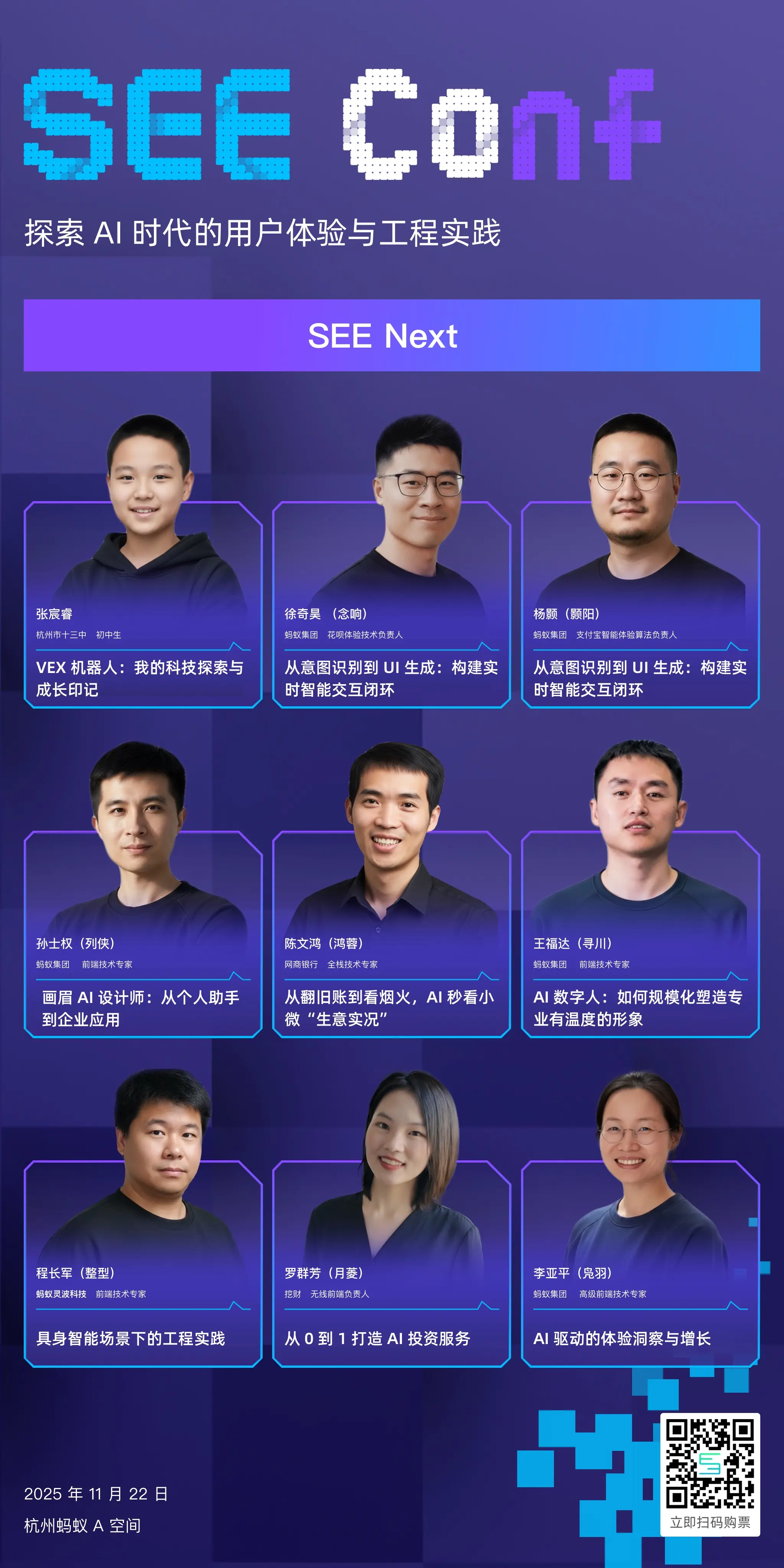 SEE Conf 2025 让我们一起思考、创造、突破,共赴 AI 时代的体验科技新纪元。11 月 22 日,我们期待与你在杭州·蚂蚁 A 空间相见!
