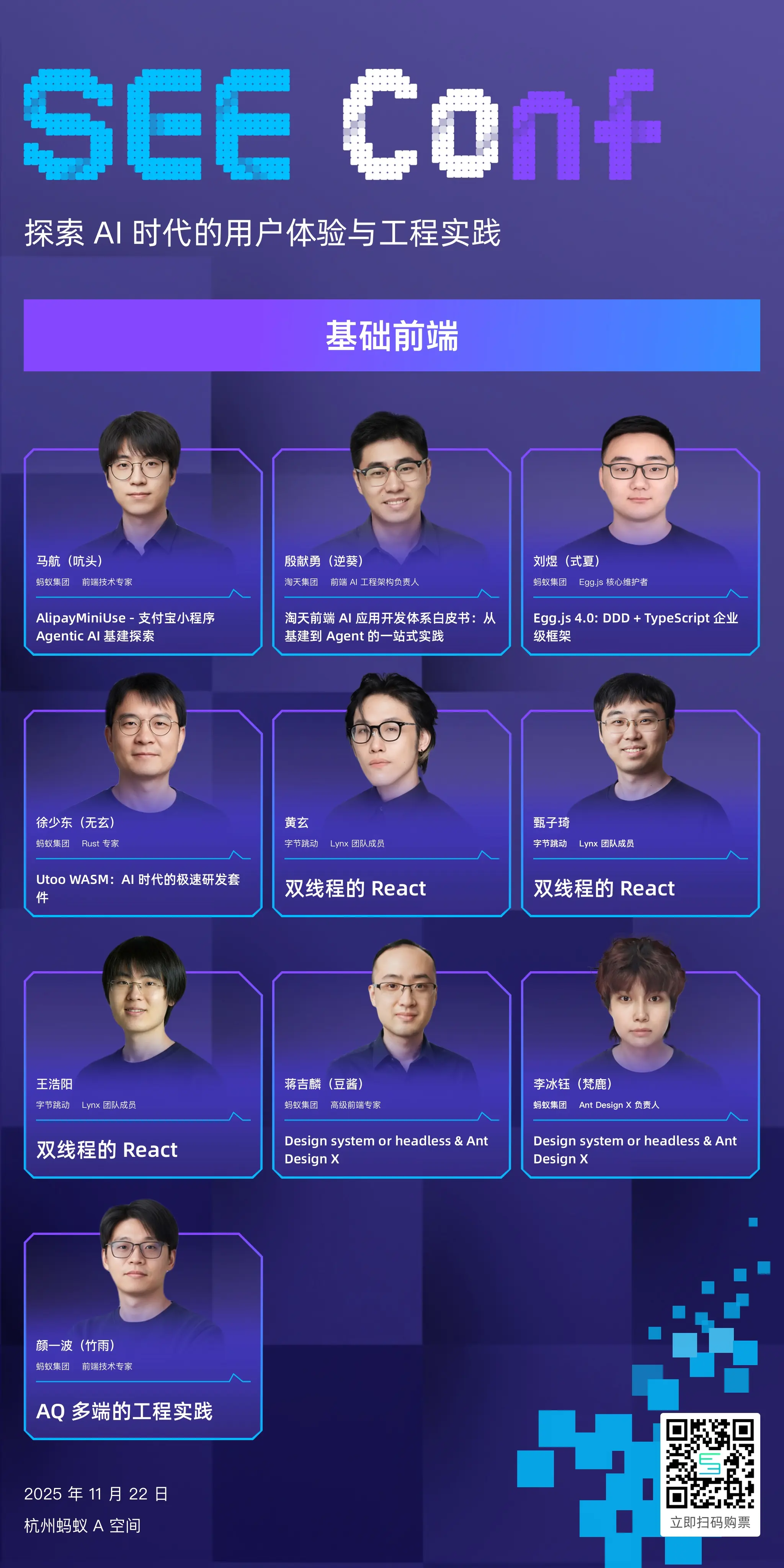 SEE Conf 2025 以「探索 AI 时代的用户体验与工程实践」为主题,将于 11 月 22 日 在杭州·蚂蚁 A 空间举办。设置上午主会场,中午乐队演出,下午 5 大专场(AI Coding、基础前端、互动与可视化、终端技术、SEE Next)平行展开,以及丰富的技术展台.