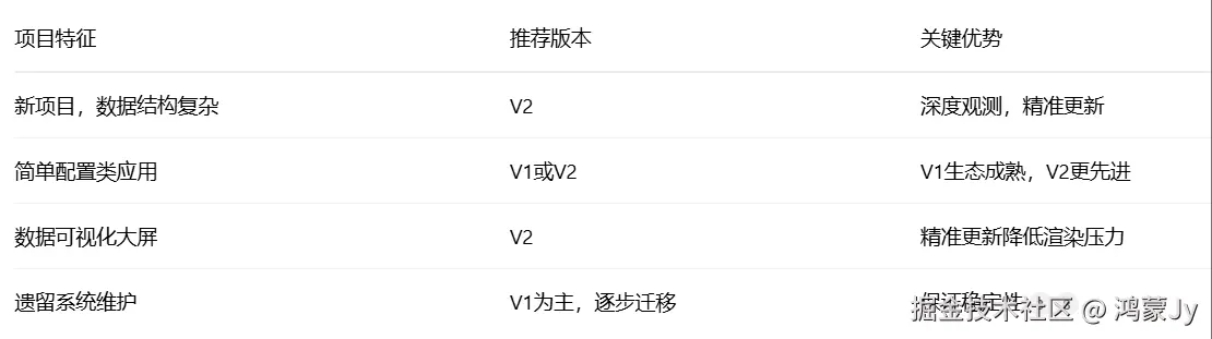 - V1 成熟稳定,适合简单场景和现有项目维护