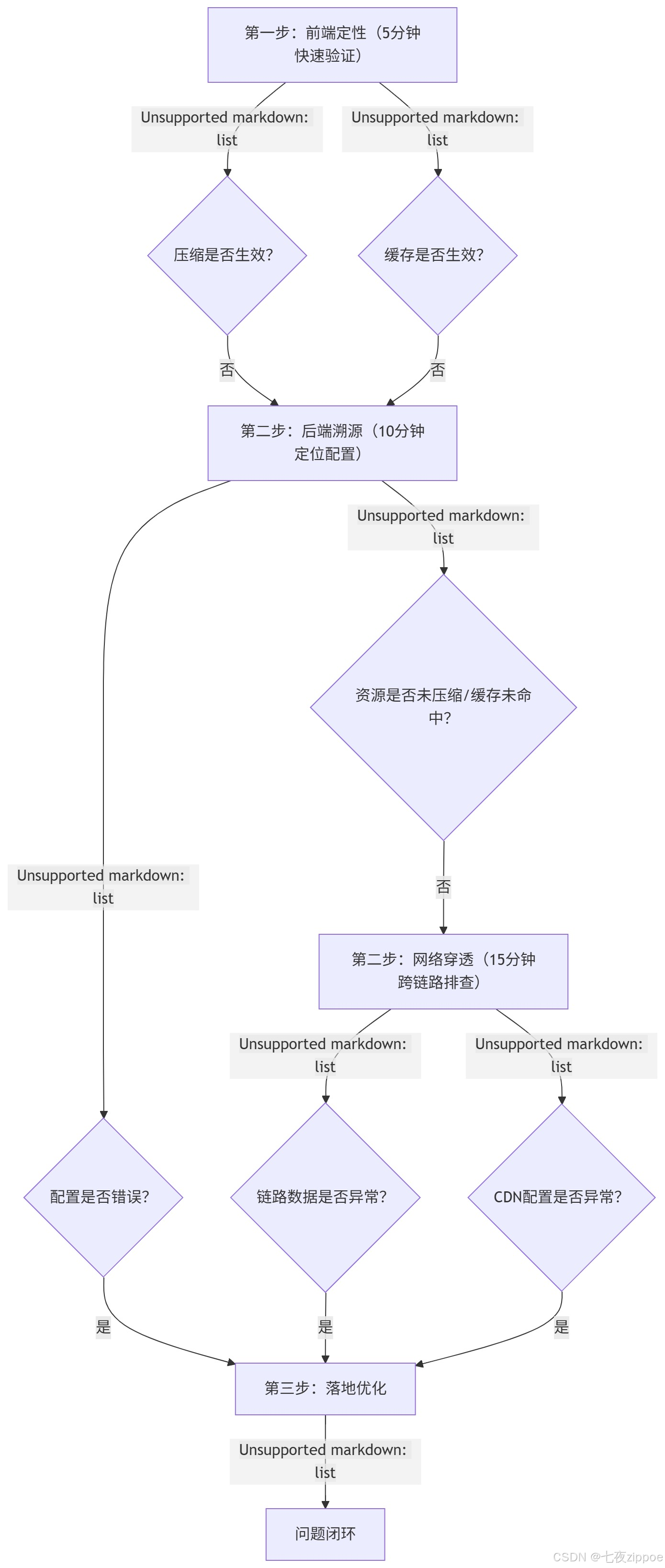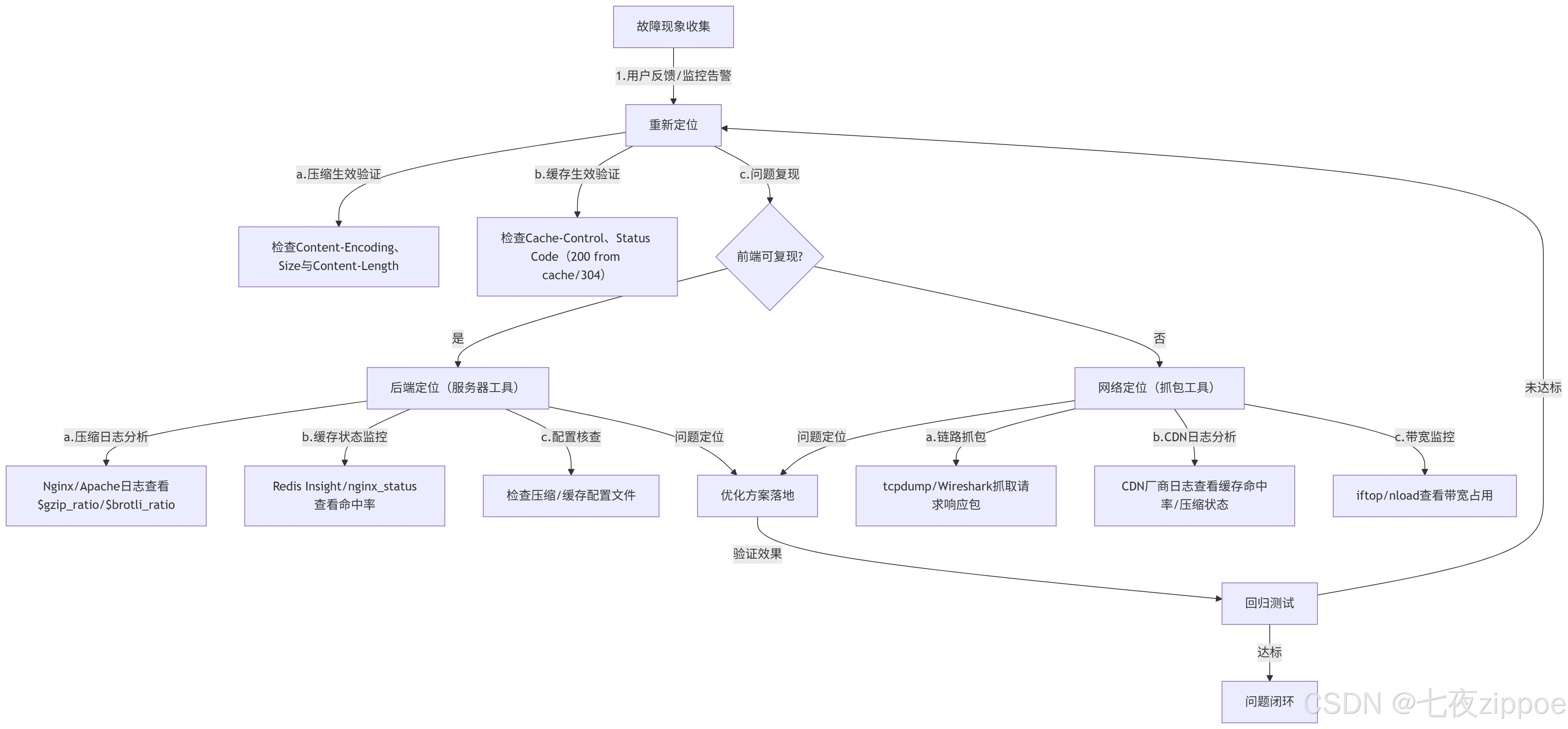 压缩与缓存故障的排查难点在于"跨链路"------前端、后端、网络、CDN任一环节出问题都会导致故障。我们总结出"前端验证→后端分析→网络溯源"三维定位工具链,新手也能按步骤快速定位,工具链整体逻辑如下: