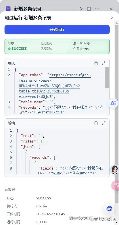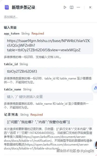 app_token:就是多维表格链接 url。table_id或者table_name:想要使用的数据表的 id。(table_id和table_name二填一即可)记录列表:要记录进表格中的内容,是一个列表结构。