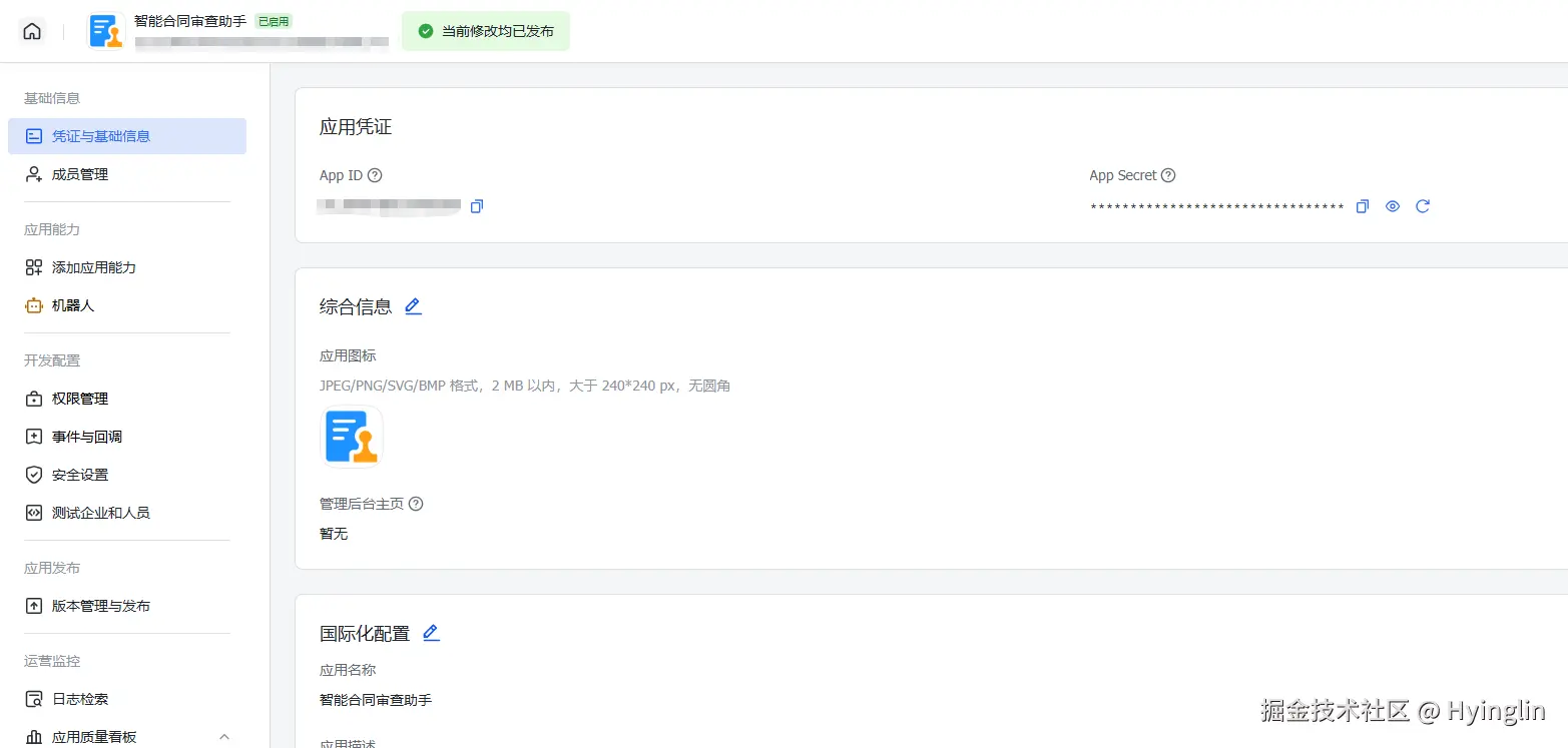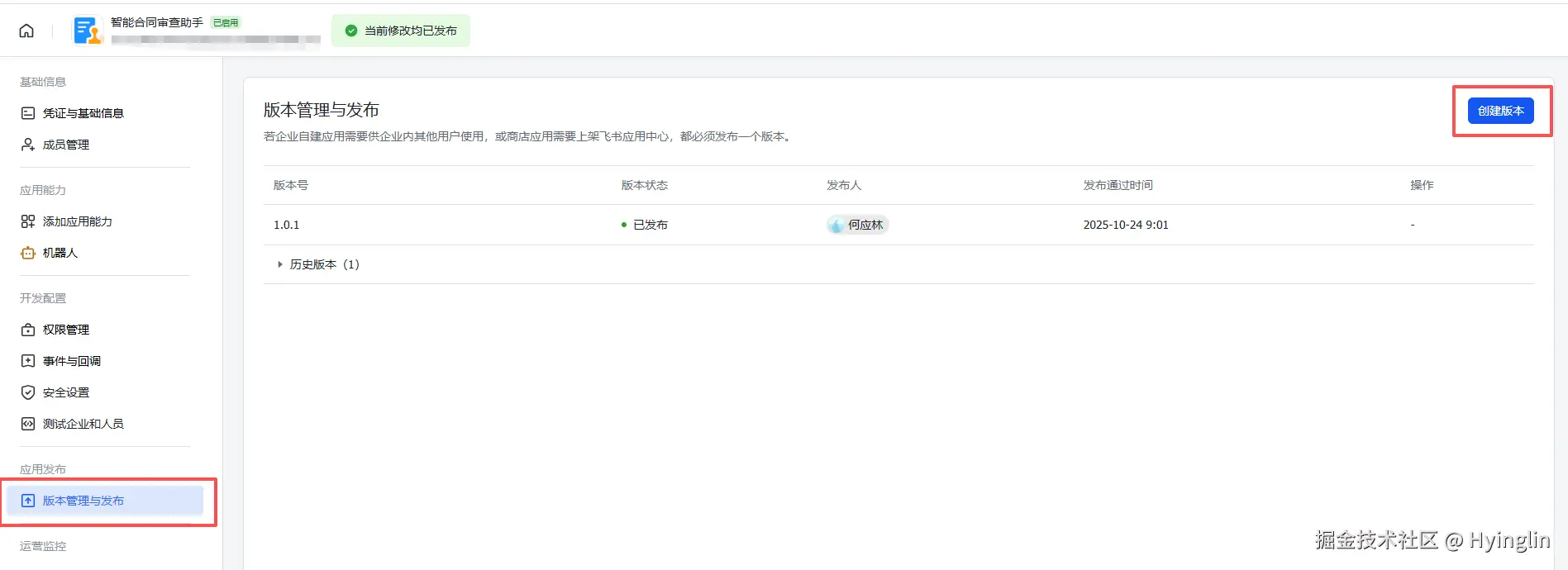 权限开通完毕,选择 版本管理与发布,发布当前应用版本。