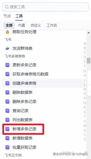 在 dify 中选择一个飞书多维表格工具(需要先安装飞书多维表格工具),例如我这里选择使用"新增多条记录"工具。