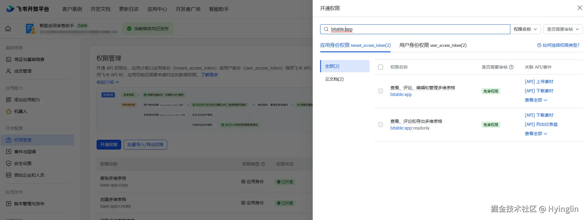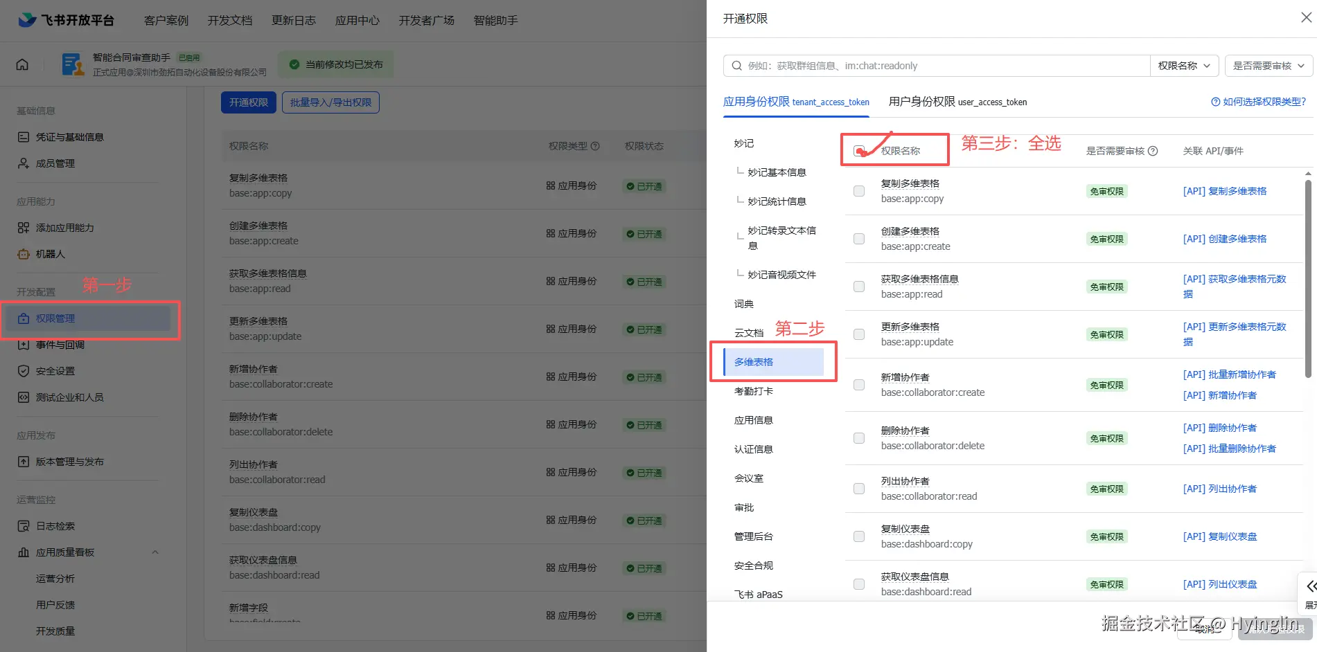 在 权限管理>开通权限>多维表格 那里选择为这个应用开通访问多维表格的权限,因为我之前已经开通过了所以显示无法选择,初次进入是可以勾选的,选择你想使用的权限。本次选择授权全部权限: