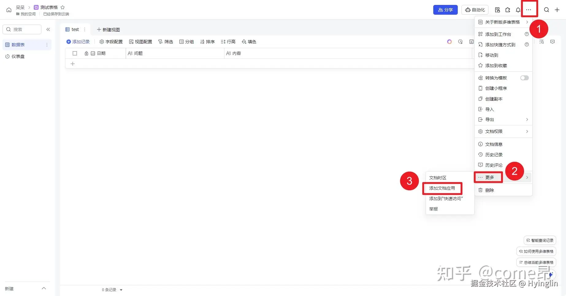 创建一个你自己想要使用的多维表格,进入多维表格页面,打开右上角 ··· ,选择"更多 ",选择"添加文档应用",在弹出的搜索框检索刚才创建的应用,例如我刚才创建的叫"飞书文档",点开添加进来。