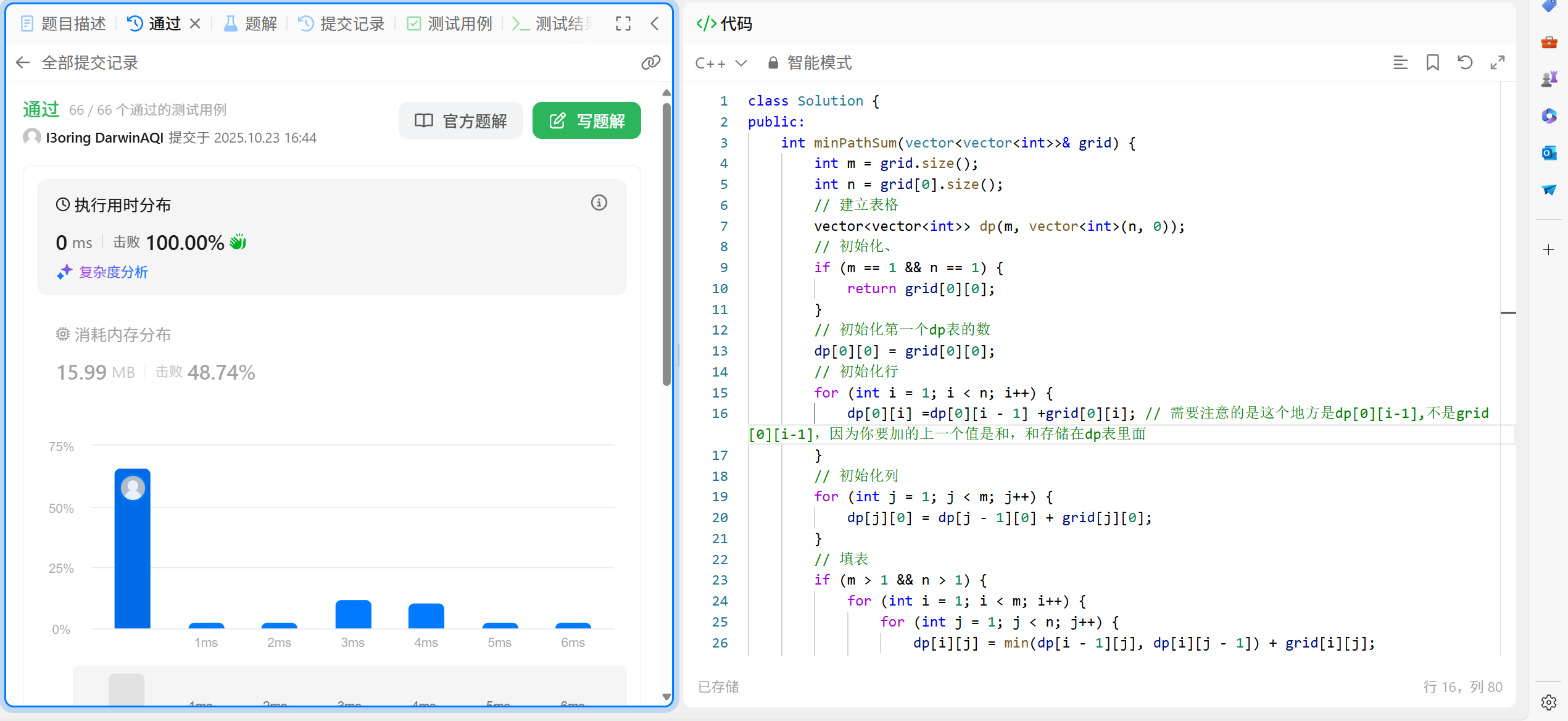 还是先创建一个同等大小的二维dp表,里面存储路径的最小和。