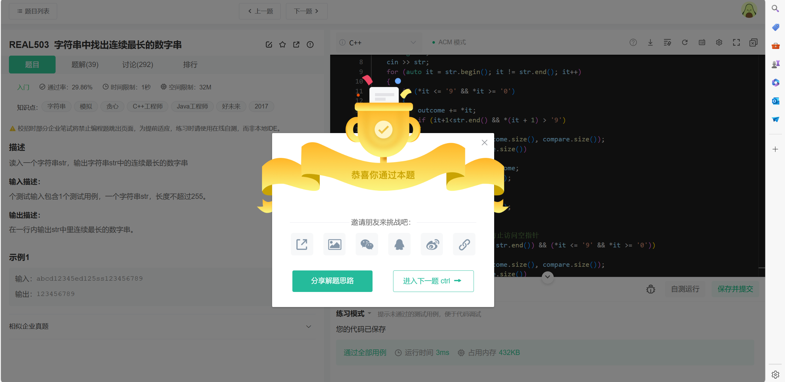 那么这道题目,作者使用的是模拟。其实也就是遍历整个字符串,将这个数字串单独放到一个字符串中,然后每次都继续比较,选出最长的子串。需要注意的是,边界情况得注意一下。(且边界情况不管是哪道题目都会有。