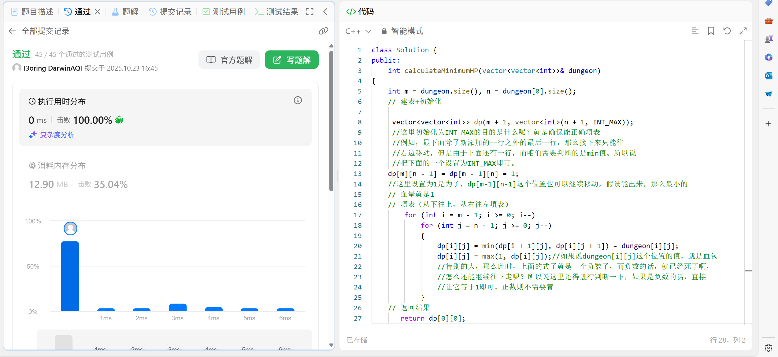 所以说,状态转移方程就确定了:dp[i][j] = min(dp[i + 1][j], dp[i][j + 1]) - dungeon[i][j];