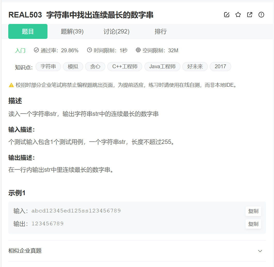 这个题目其实挺简单的,就是让你在给定的字符串中找出连续最长的由数字构成的子串即可。