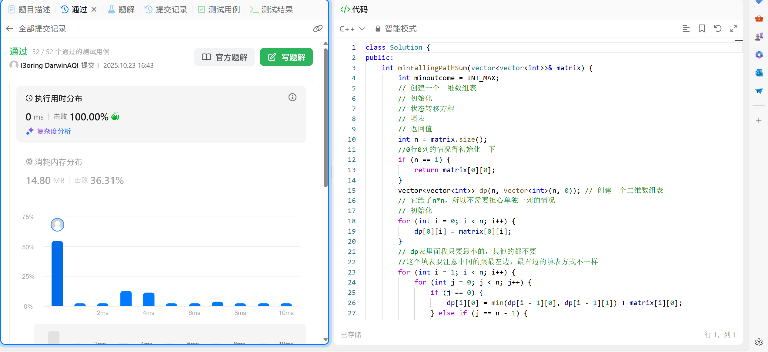 所以,状态转移方程为:dp[i][j] = min(min(dp[i - 1][j], dp[i - 1][j - 1]),dp[i - 1][j + 1]) +matrix[i][j]