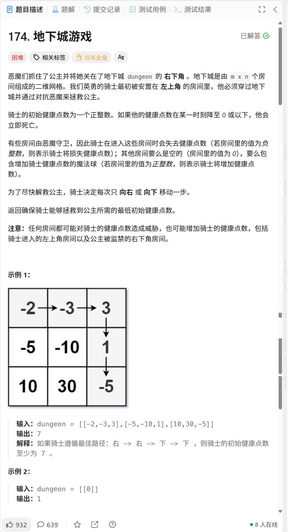 哎呦我的天哪,这道题可把我坑惨了。为什么这么说,咱们待会再说。这道题目,本质就是求最小,但是不同的是,这个地方的骑士血量不可以小于等于0.