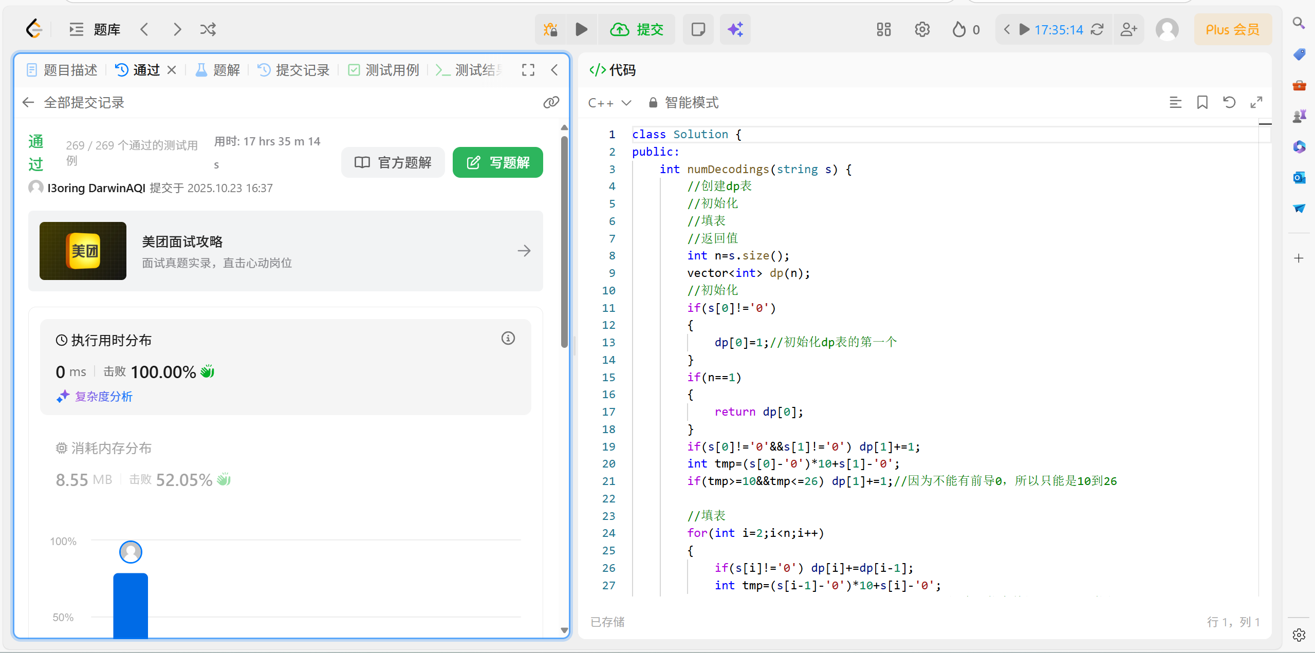 返回值是dp[n-1],因为咱们要知道,咱们创建的这个dp表的下标其实是从0开始的。