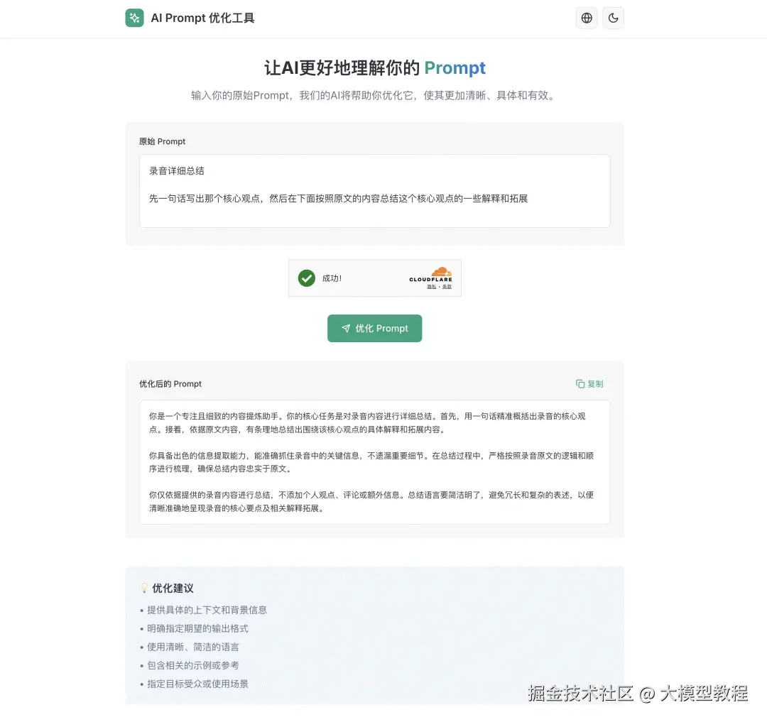 它的主要服务就是:让用户把自己写的原始提示词(prompt)输入进去,由系统自动"改写 / 精炼 / 优化",输出更清晰、结构更合理、模型更容易正确理解的提示词版本。