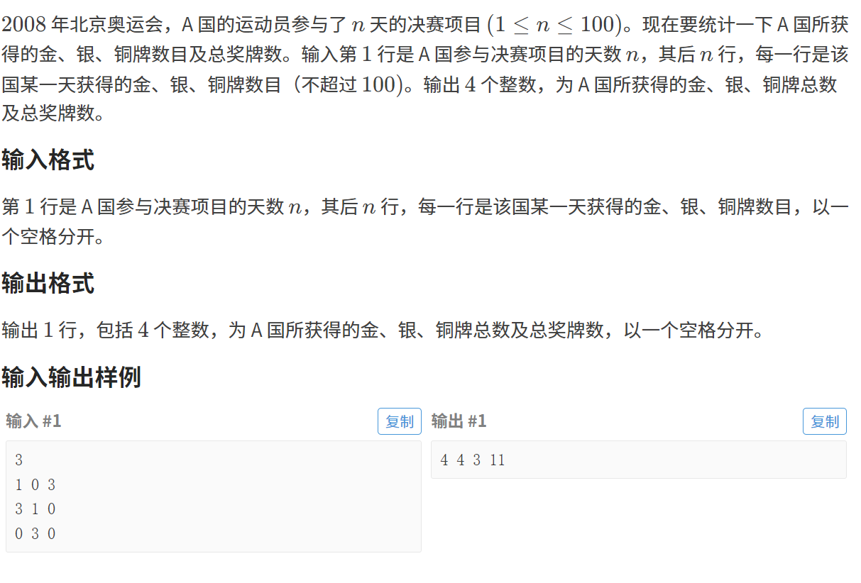 cout << sum_a << " " << sum_b << " " << sum_c << " " << sum;