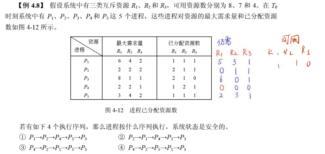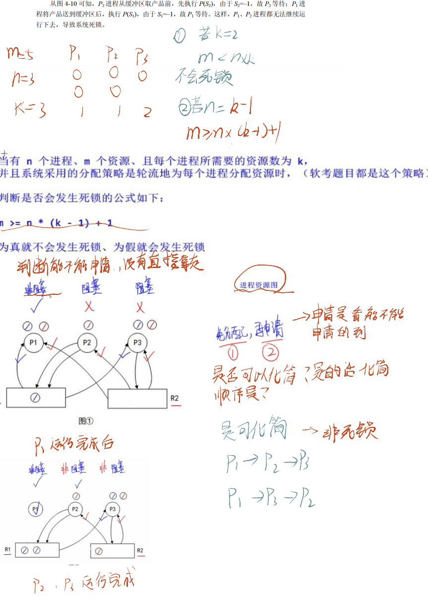 - 不发生死锁的最小资源数:n×(R-1)+1------ 在死锁最大资源数的基础上增加 1 个资源,此时至少有一个进程能获得 "R 个资源" 并完成,释放资源后其他进程可继续执行。例如,3 个进程,每个需 2 个资源,不死锁最小资源数 = 3×(2-1)+1=4(1 个进程获得 2 个资源完成,释放后其他进程各获得 1 个,可继续执行)。