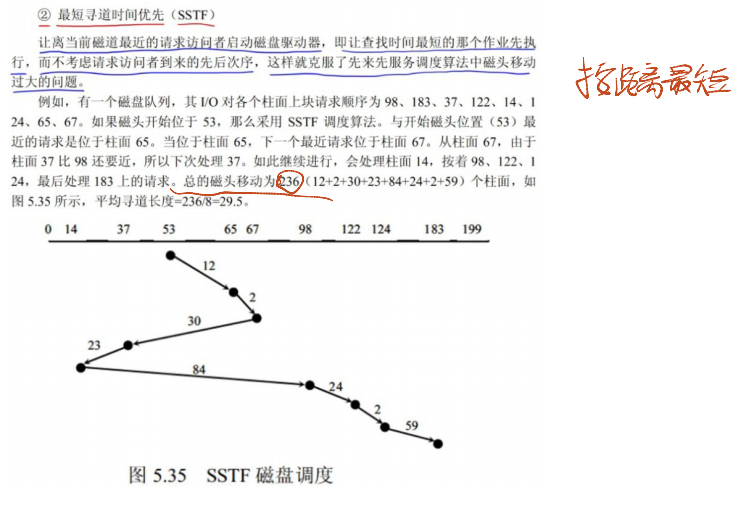- 原理:选择 "与当前磁道距离最近的请求" 调度,最小化每次寻道时间。例如,当前磁道为 10,请求序列为 "20→5→25",SSTF 先调度 5(距离 5),再调度 20(距离 15),最后调度 25(距离 5)。