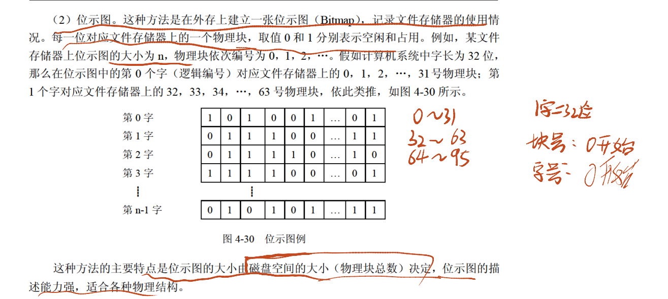 - 优点:查询速度快(可按位运算快速找到空闲块),内存占用少;缺点:需预先计算位与磁盘块的对应关系。