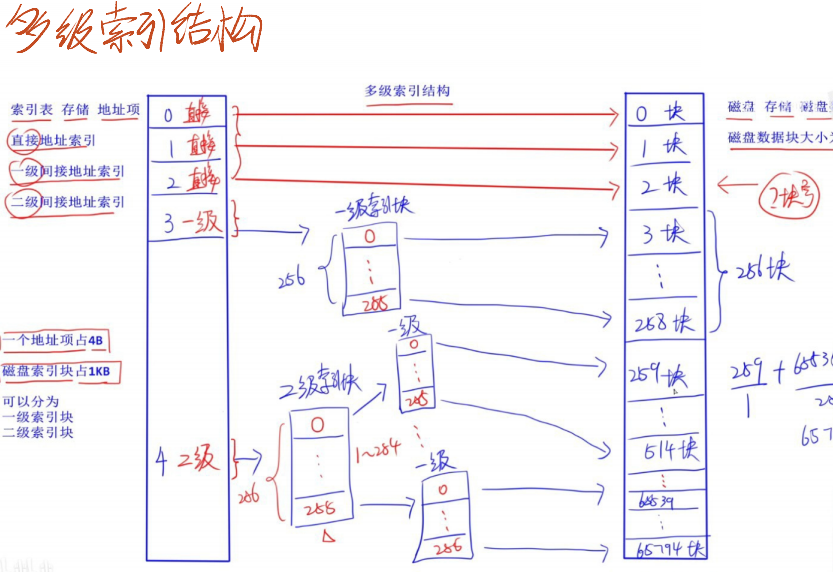 - 11 号索引节点:二级间接索引 ------ 存储 "一级间接块的地址",一级间接块存储 "二级间接块的地址",二级间接块存储数据块地址。可管理 1024×1024×4KB=4096MB(4GB)的数据。