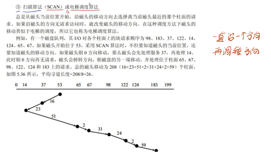 - 原理:磁头沿一个方向(如从外向内)移动,途中处理所有经过磁道的请求;到达最内磁道后,反向(从内向外)移动,继续处理请求,类似电梯上下运行。例如,当前磁道为 10,方向向外,请求序列为 "5→20→15→25",磁头先到 5(处理请求),再到 0(最内磁道),反向后到 15(处理)、20(处理)、25(处理)。
