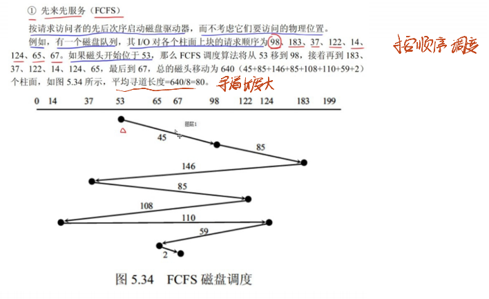 - 原理:按进程请求访问磁盘的 "先后顺序" 调度磁头。例如,请求序列为 "磁道 10→磁道 20→磁道 5",磁头从当前磁道(如 0)先到 10,再到 20,最后到 5。
