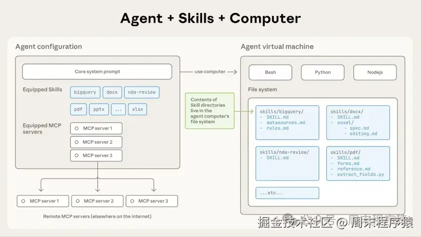 Skills:提供 "如何完成任务" 的流程性知识与操作步骤- 二者可协同:MCP 负责接入工具与数据,