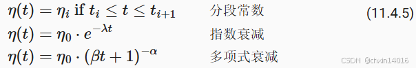 - 其次,衰减速率同样很重要。如果学习率持续过高,我们可能最终会在最小值附近弹跳,从而无法达到最优解。 11.5节比较详细地讨论了这一点,在 11.4节中我们则分析了性能保证。简而言之,我们希望速率衰减,但要比