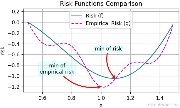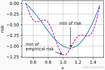 下图说明,训练数据集的最低经验风险可能与最低风险(泛化误差)不同。
