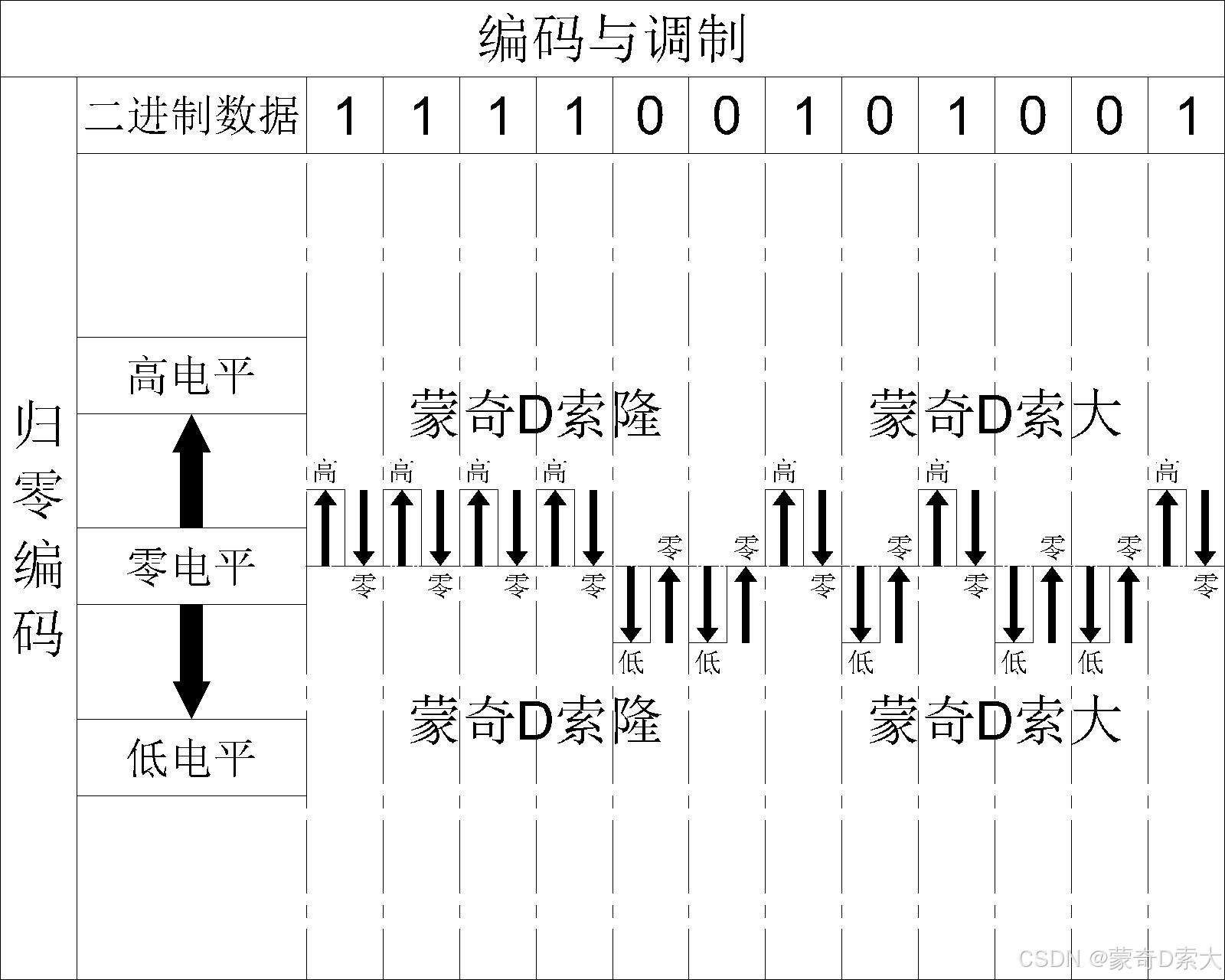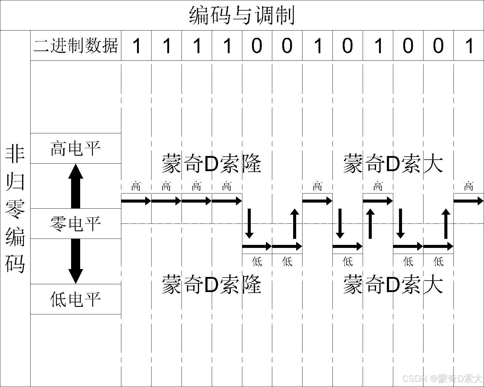 - 非归零( N R Z ( N o n e _ R e t u r n _ t o _ Z e r o ) NRZ(None \_ Return \_ to \_ Zero) NRZ(None_Return_to_Zero))编码 :用高电平表示 1 1 1 、低电平表示 0 0 0 (或者相反)。