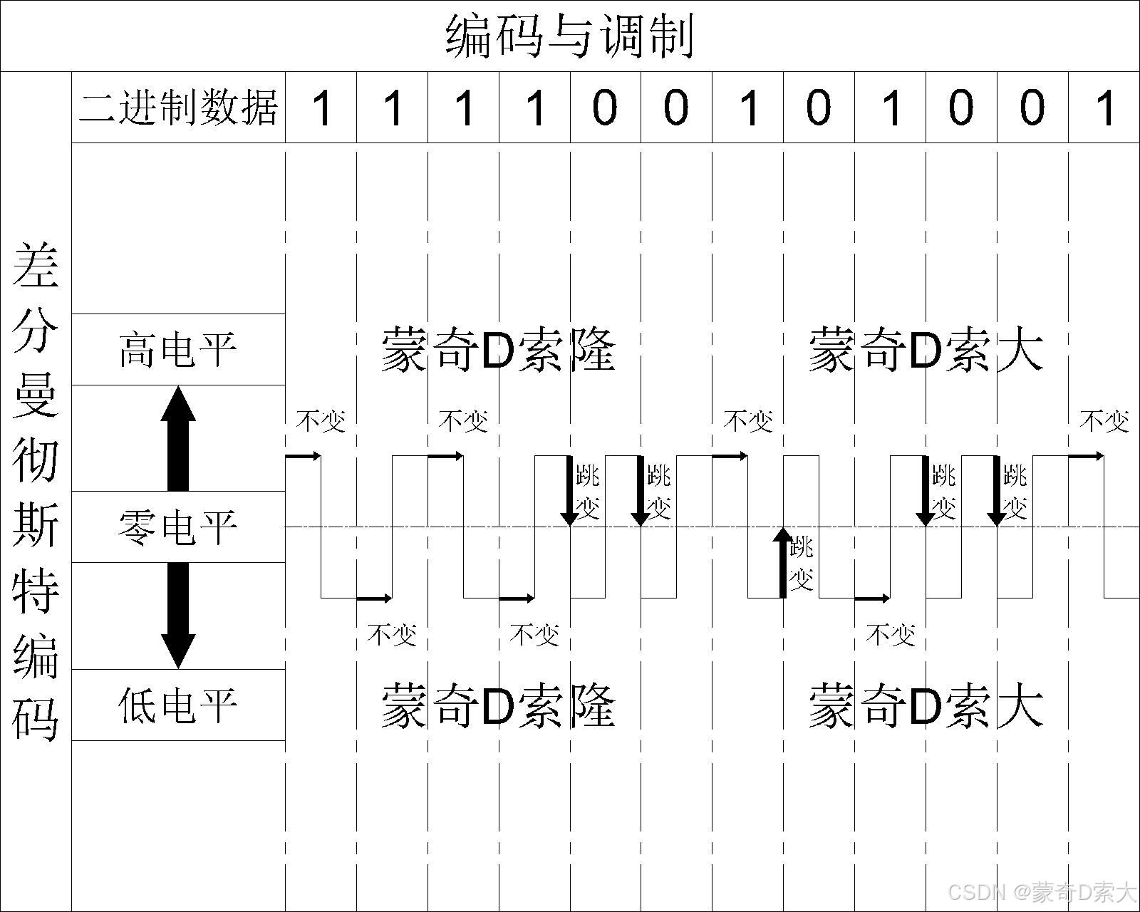 在码元中间的跳变表示的仅仅是时钟信号,这种编码逻辑使得差分曼彻斯特编码拥有更强的抗干扰能力,其被广泛用于宽带高速网中。