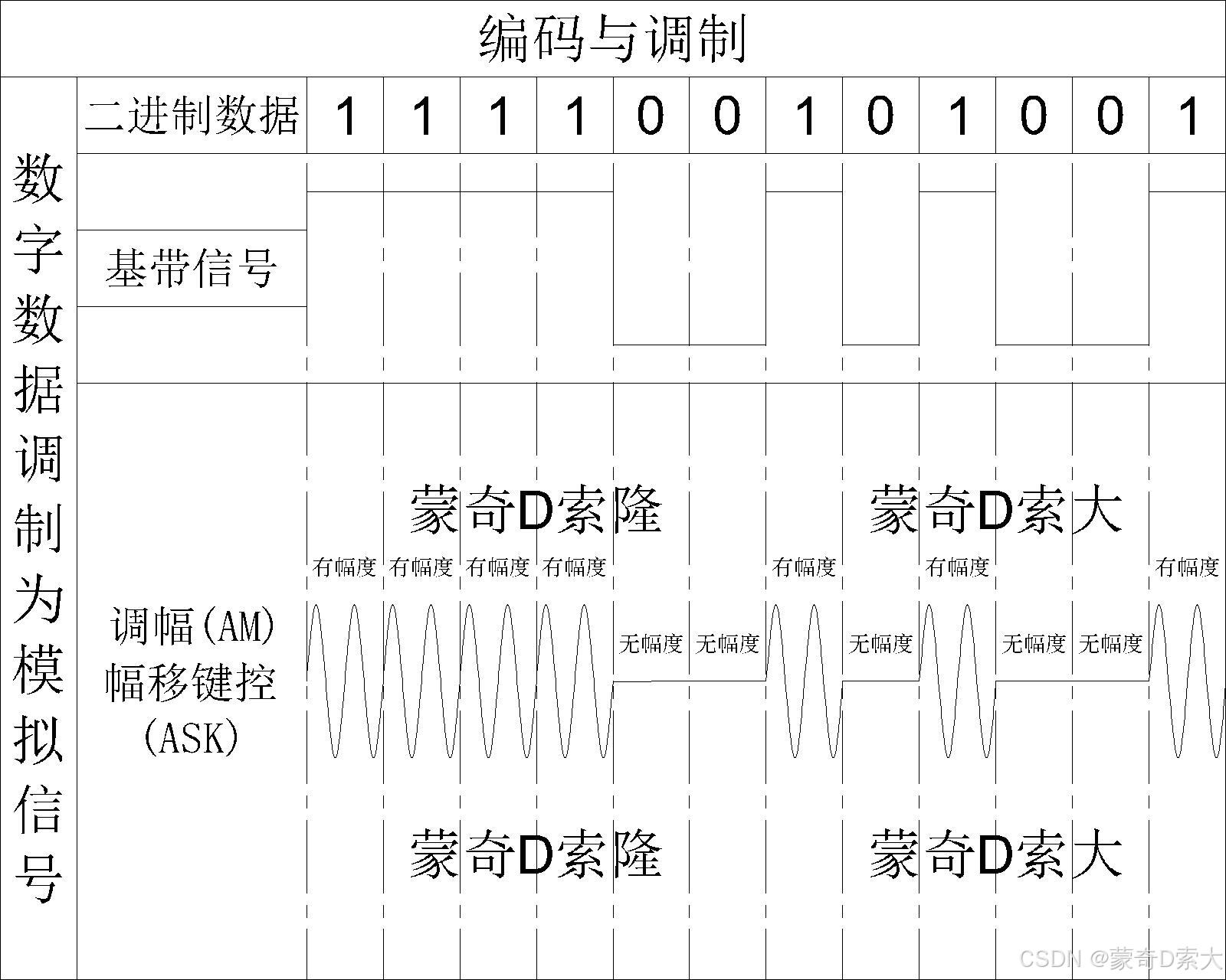 - 调幅( A M ( A m p l i t u d e _ M o d u l a t i o n ) AM(Amplitude\_Modulation) AM(Amplitude_Modulation))或幅移键控( A S K ( A m p l i t u d e _ S h i f t _ K e y i n g ) ASK(Amplitude\_Shift\_Keying) ASK(Amplitude_Shift_Keying))。通过改变载波的振幅来表示数字信号 1 1 1 和 0 0 0 。